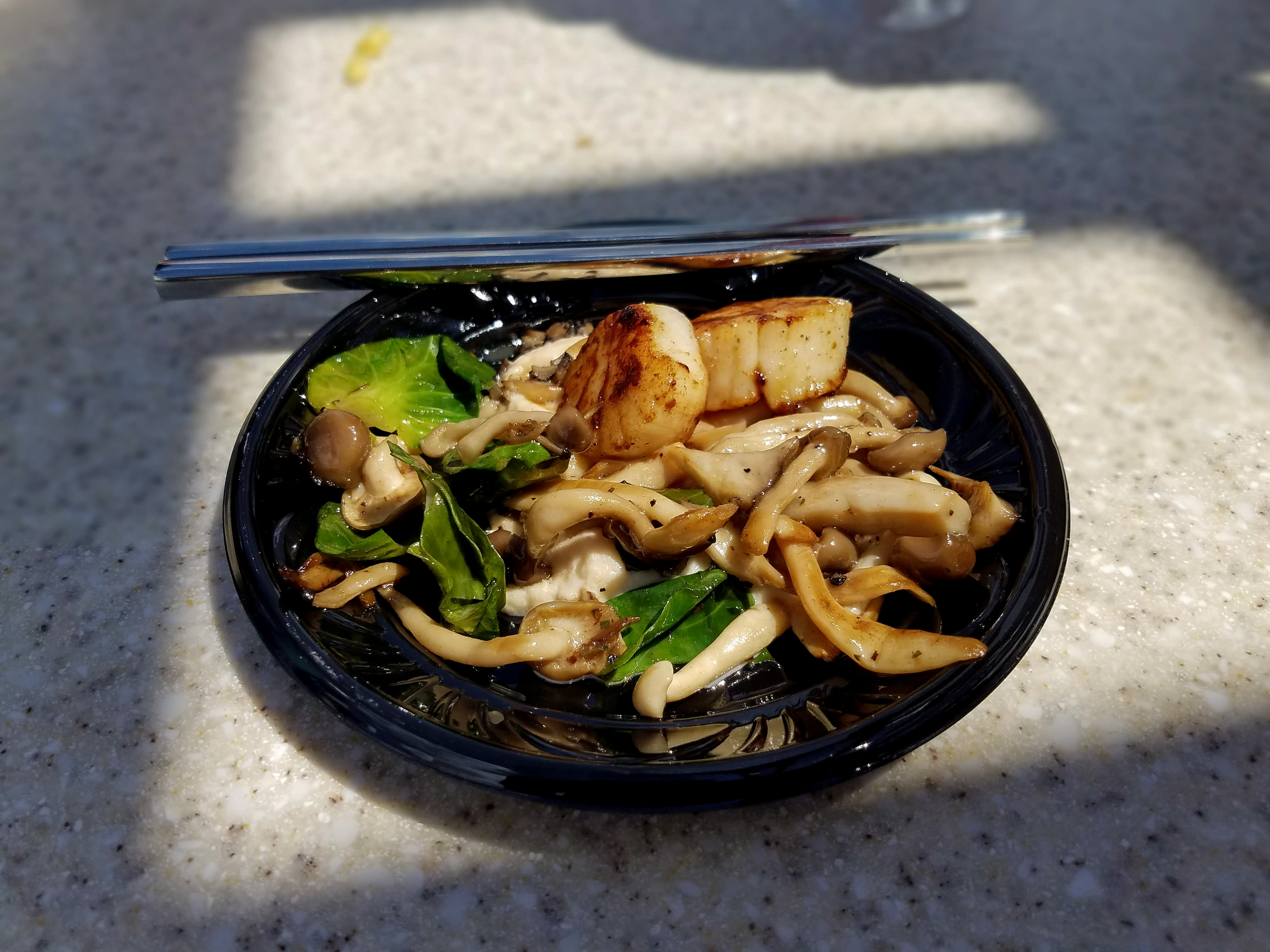 Between sodium in the foods as well as walking around the park on a hot day, it was definitely important to keep hydrated. We often took walking breaks back over to one of the restaurants to fill up our water bottles with some ice water. On the way back out to the World Showcase, we stumbled across the Wine & Dine Studio specialty booth. I had read up on a few blog articles about how the seared scallops dish at the booth was one of the top things to eat while at the festival; it was time to take a quick pit stop and see what all the hype was about.