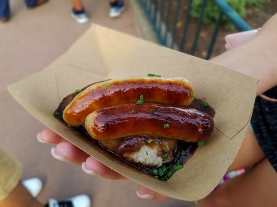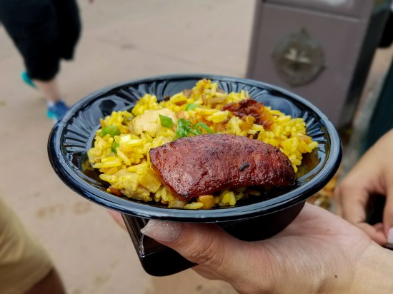 After stocking up on some more food as well as walking around the shops in the Japan area, we set out to finish our loop around the World Showcase. We ended up all the way back at the northern side of the lagoon (for perspective, Japan is situated over on the southern side). Along the way, we passed by the Spain booth, where we picked up a plate of chorizo and roasted chicken paella. The piece of chorizo was probably the tastiest item that was on the plate, with the majority of the rice seeming a little dry.