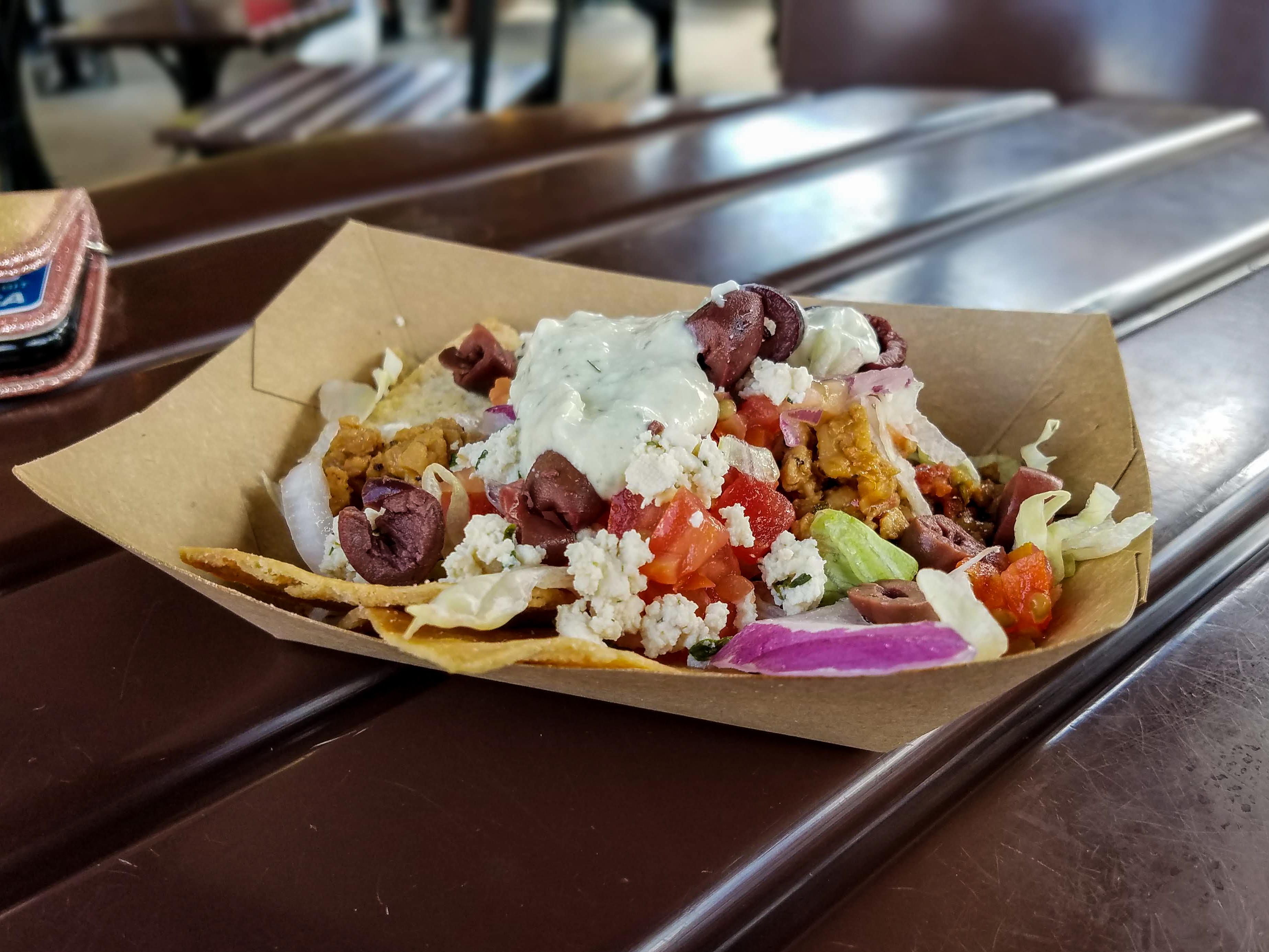Pita chips topped with meatless sausage, diced tomatoes, red onions, lettuce, kalamata olives, and a vegan tzatziki sauce.