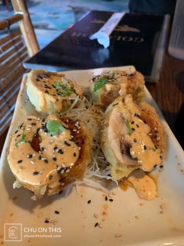 Deep fried mushrooms stuffed with spicy tuna, topped with spicy mayo, eel sauce, and smelt roe.