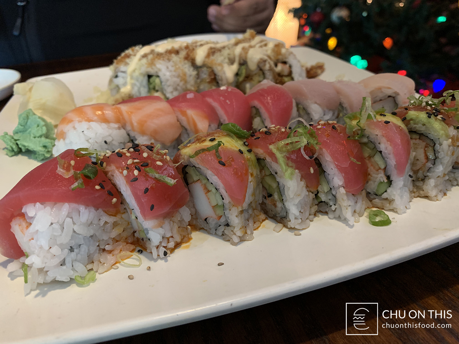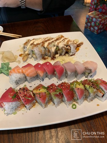 Crab, cucumber, and avocado on the inside, with tuna, yellowtail, and salmon on the top.