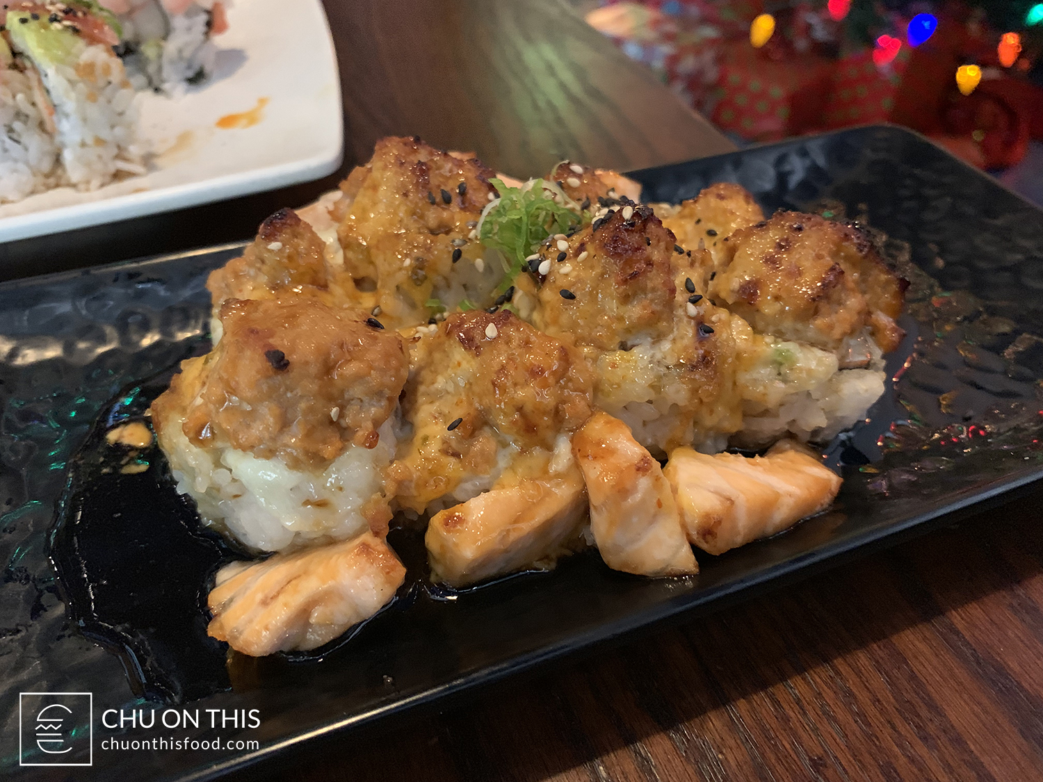 Crab and avocado on the inside, baked with spicy tuna and spicy mayo on top. Finished with baked salmon chunks, eel sauce, smelt roe, and scallions.