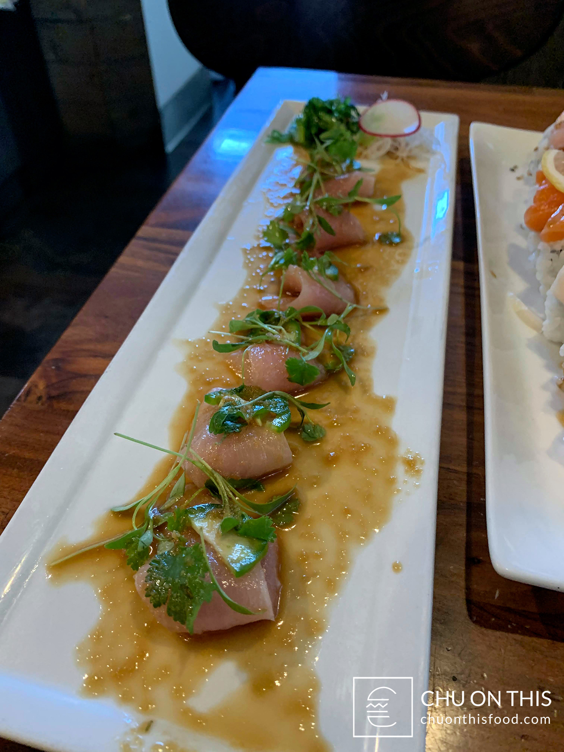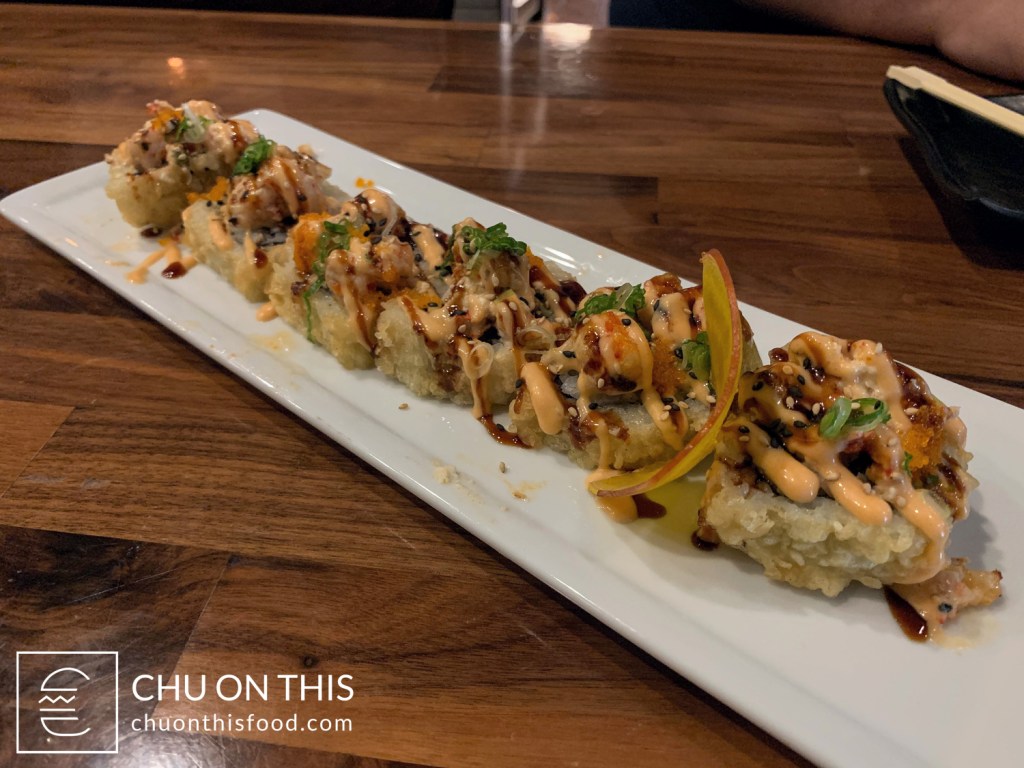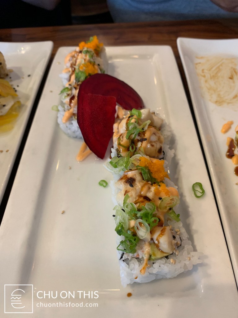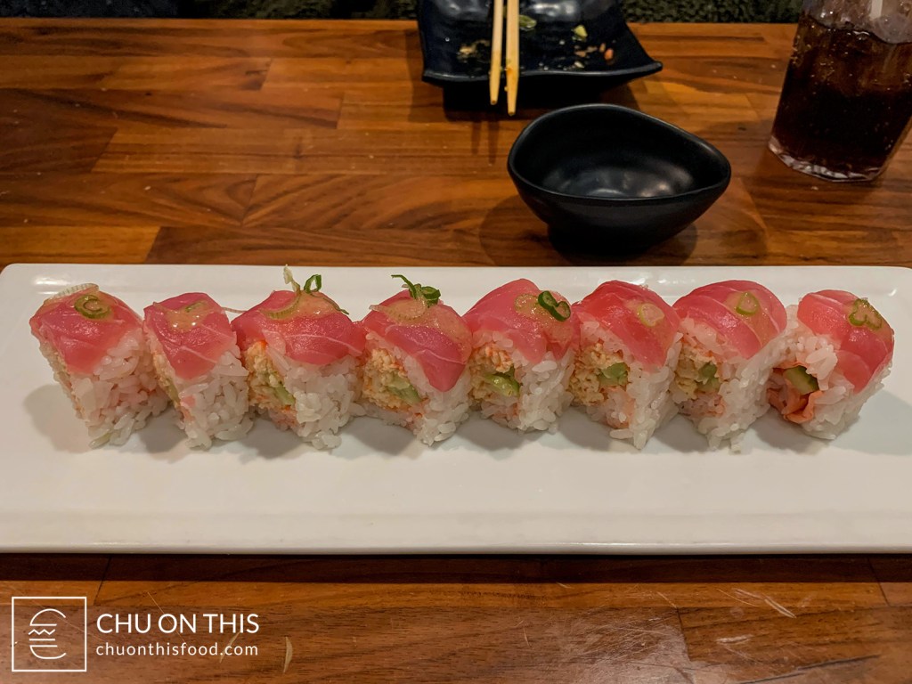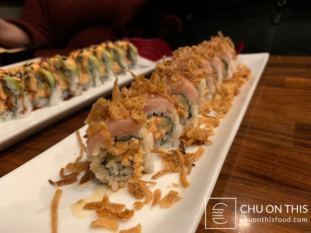 It was tough to choose a place to start, so I decided to first dive into one of the rolls I picked out: the Albacore Lovers Roll. Spicy tuna and crab on the inside, coupled with cucumber, with more albacore tuna over the top, garnished with crunchy onions, sesame, and a ponzu sauce. This roll definitely looked the busiest on the plate out of the four. But the aspect that I enjoyed the most about it was the textural play between the crunchy onions and spicy tuna mixture inside the roll. The flavors were balanced just right between savory and spicy.
