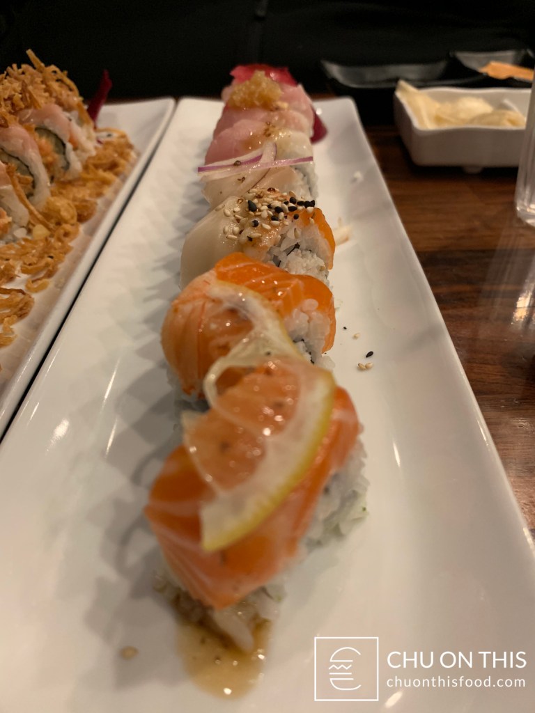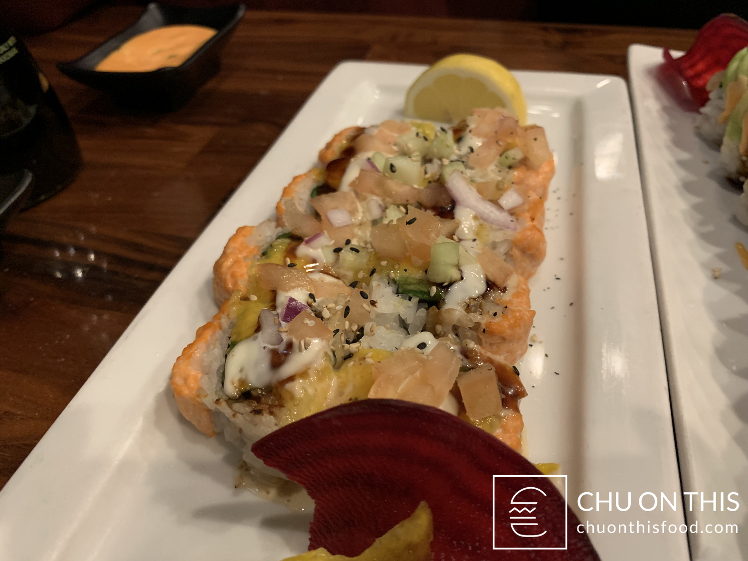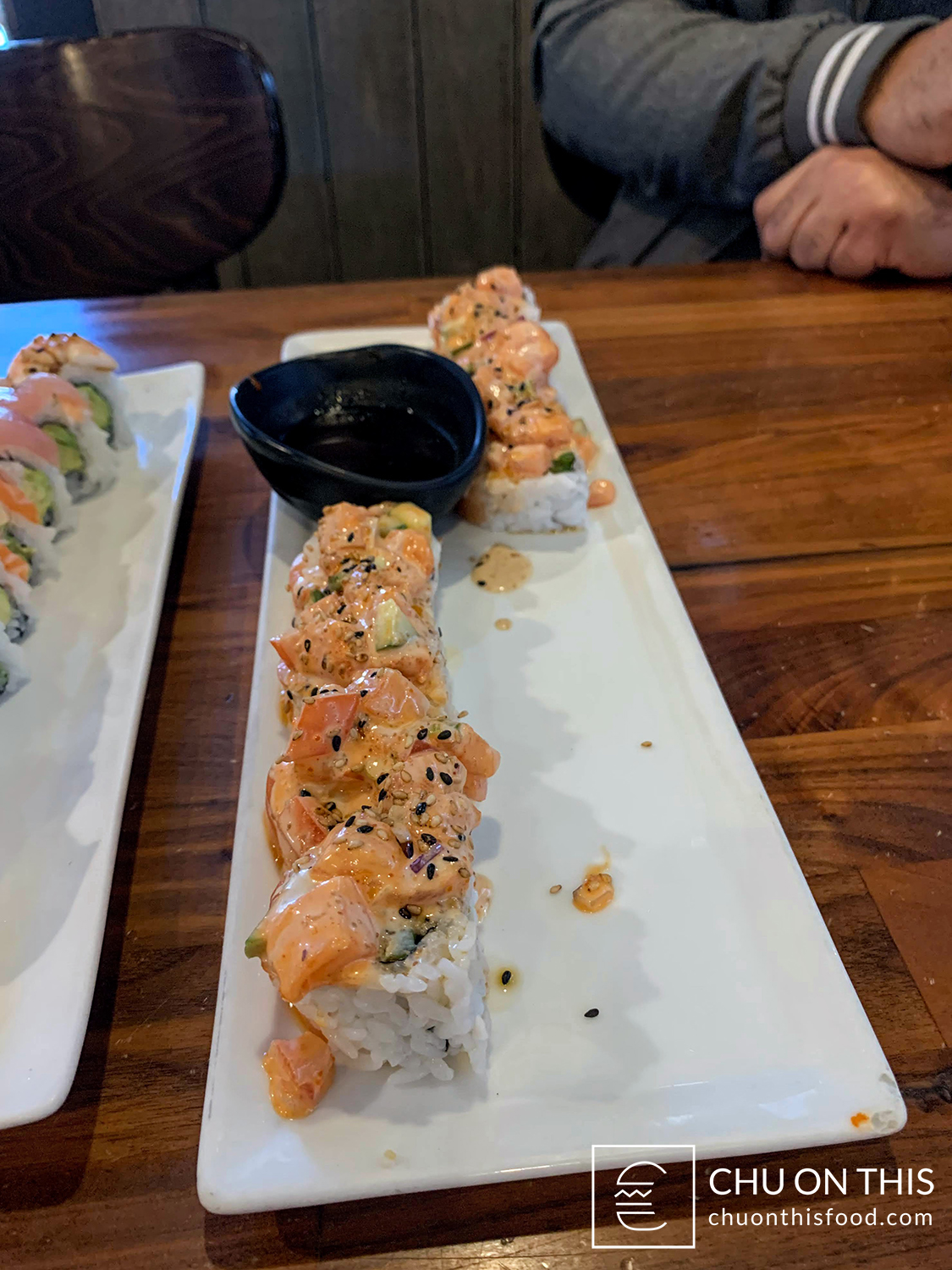 Last, but not least, the Baked Salmon Roll was the final one I had left to sample. Cooked salmon on the top, crab and avocado on the inside, topped with salsa and garnished with honey Dijon mustard, yuzu aioli, and a dose of soy sauce. A lemon slice was also served on the plate for you to squeeze fresh onto the roll. The combination of the salsa, honey Dijon, and lemon juice helped give each bite that acidic punch to really accentuate the flavor.