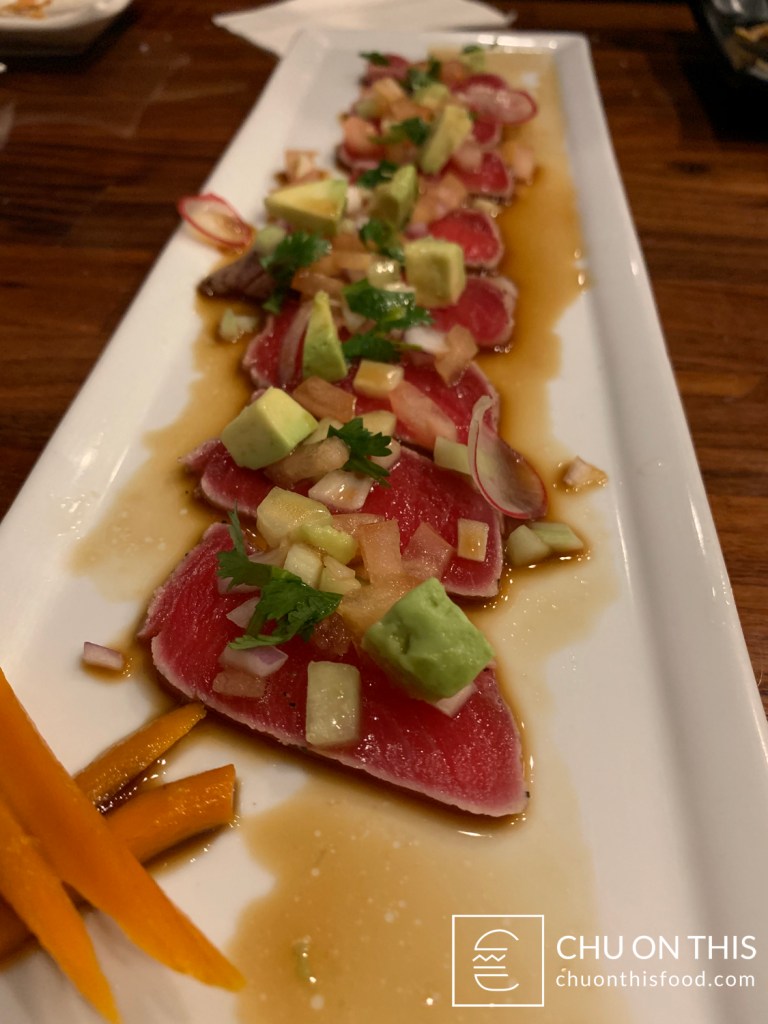Thin slices of seared albacore, dressed with salsa, avocado chunks, thin slices of pickled radishes. Finished with cilantro and ponzu.