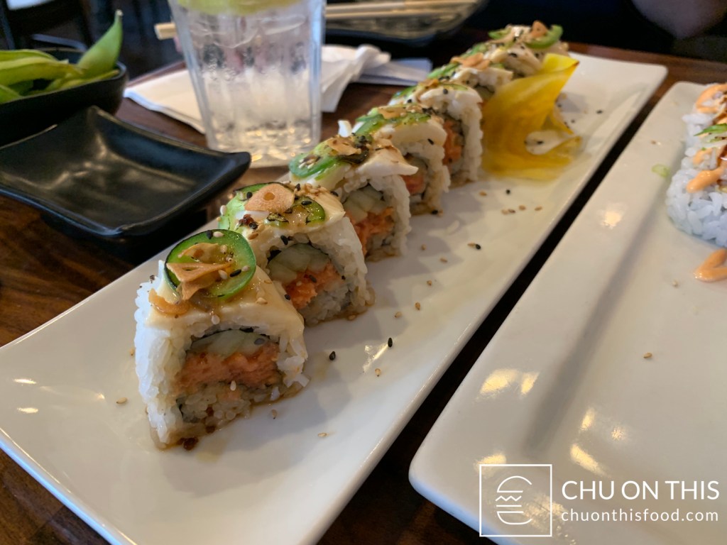 Crab, avocado, and jalapeño on the inside, topped with salmon tossed in spicy chili oil and creamy sesame sauce, garnished with toasted sesame seeds.