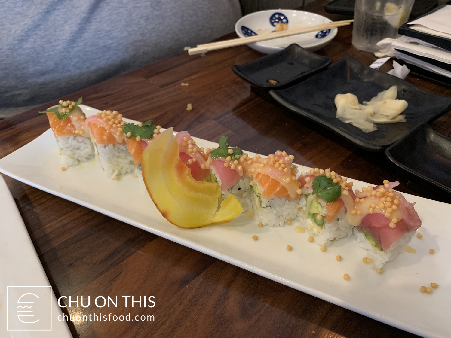 I set my sights on trying the Rainbow Roll next, which I thought had the nicest visual aesthetics out of all the rolls. The tuna, yellowtail, albacore, shrimp, and salmon layered over a traditional California Roll had an amazing transition of color as you looked from one end of the plate to the other. It was also great in the sense that each piece gave you flavors from the various types of fish.