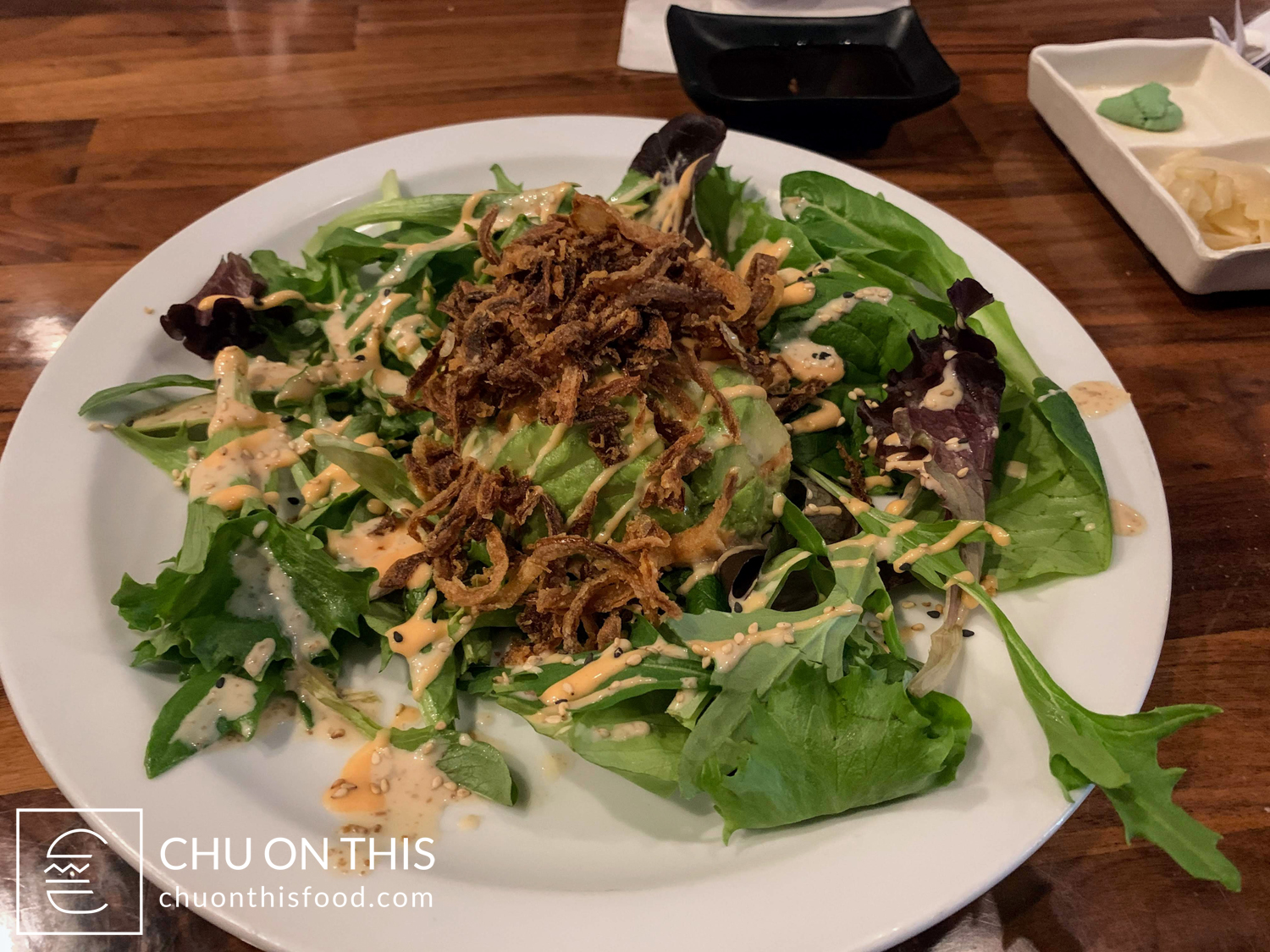 Albacore wrapped in avocado and topped with crispy onions and spicy mayo. Served on top of a spring mix.