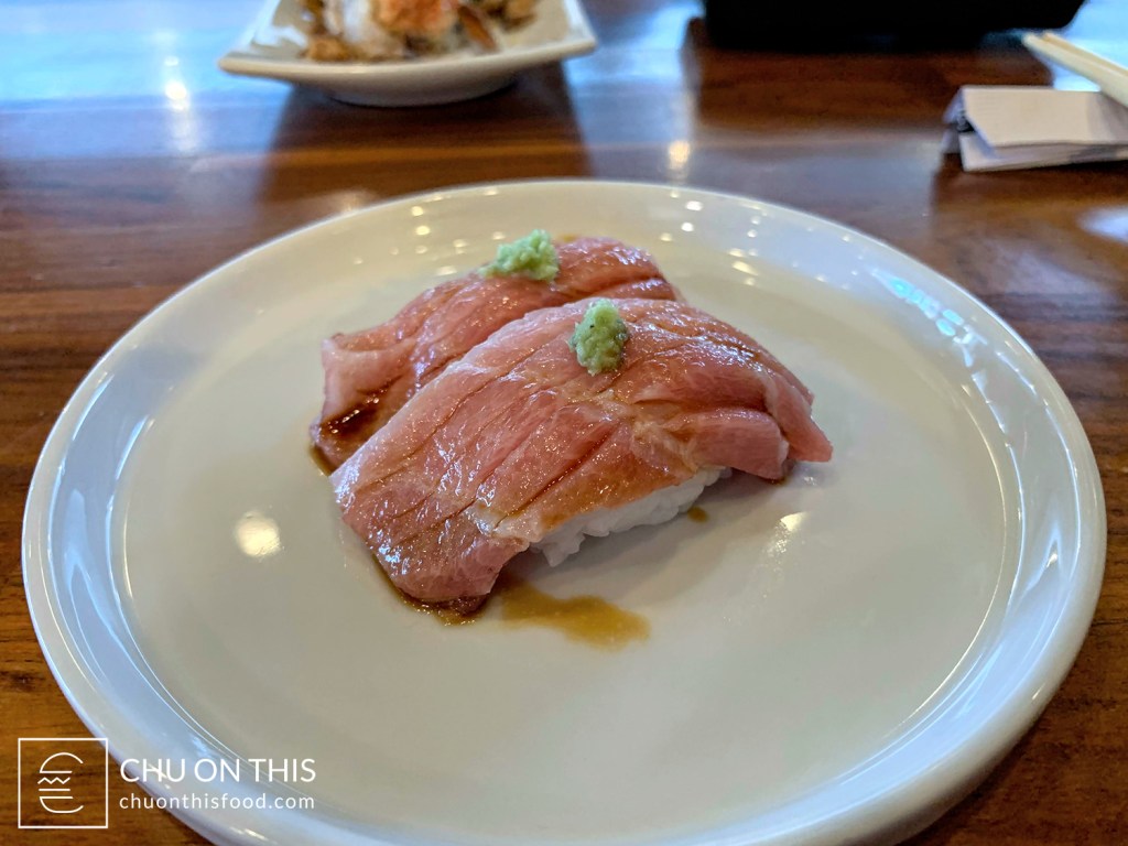 After we finished scarfing down the sushi, Kevin and I turned to each other and said, “You know what? I think we’ve got room for one more plate of food.” We broke the menu back out again and started looking at the cold sashimi section, thinking those items might be light enough to be a good finisher for the meal. We put in an order for the seared albacore sashimi, which arrived tableside not too long after.