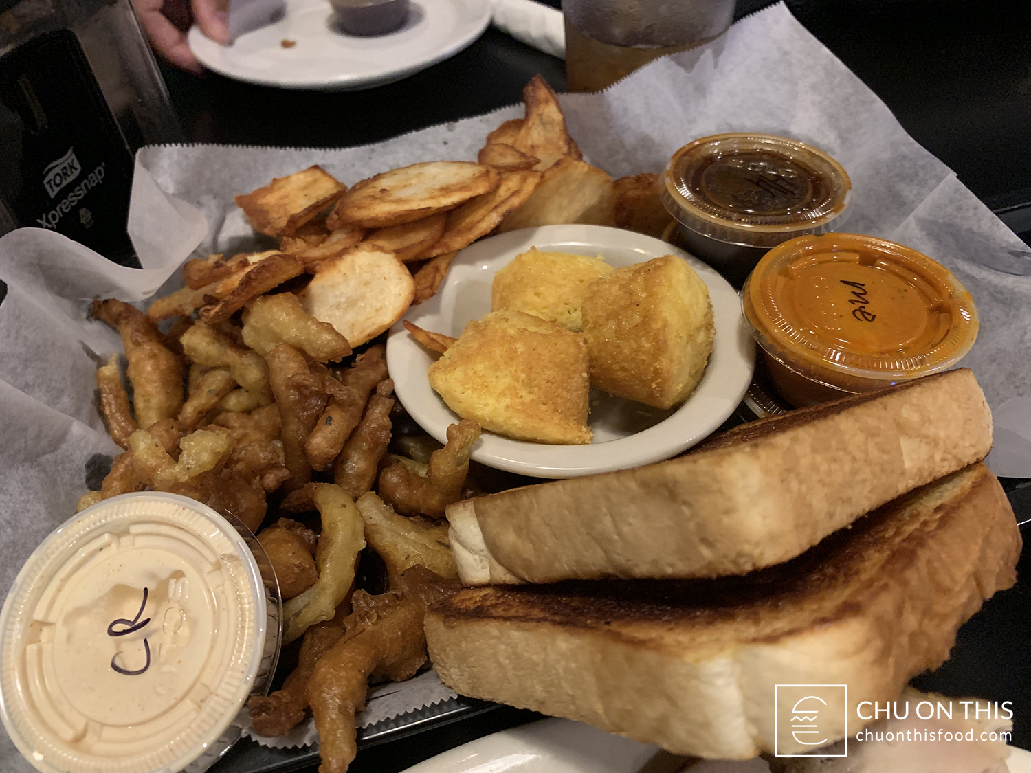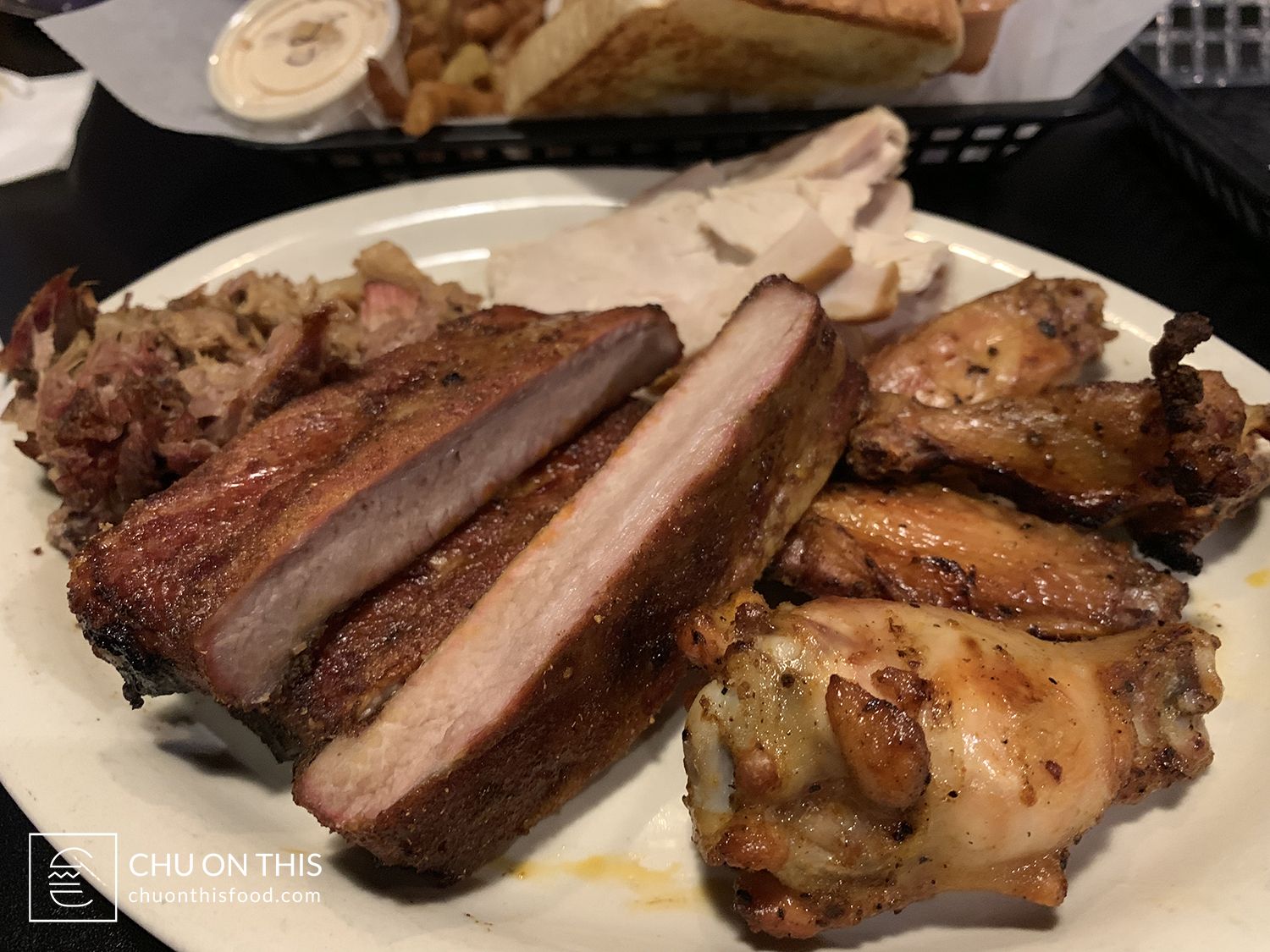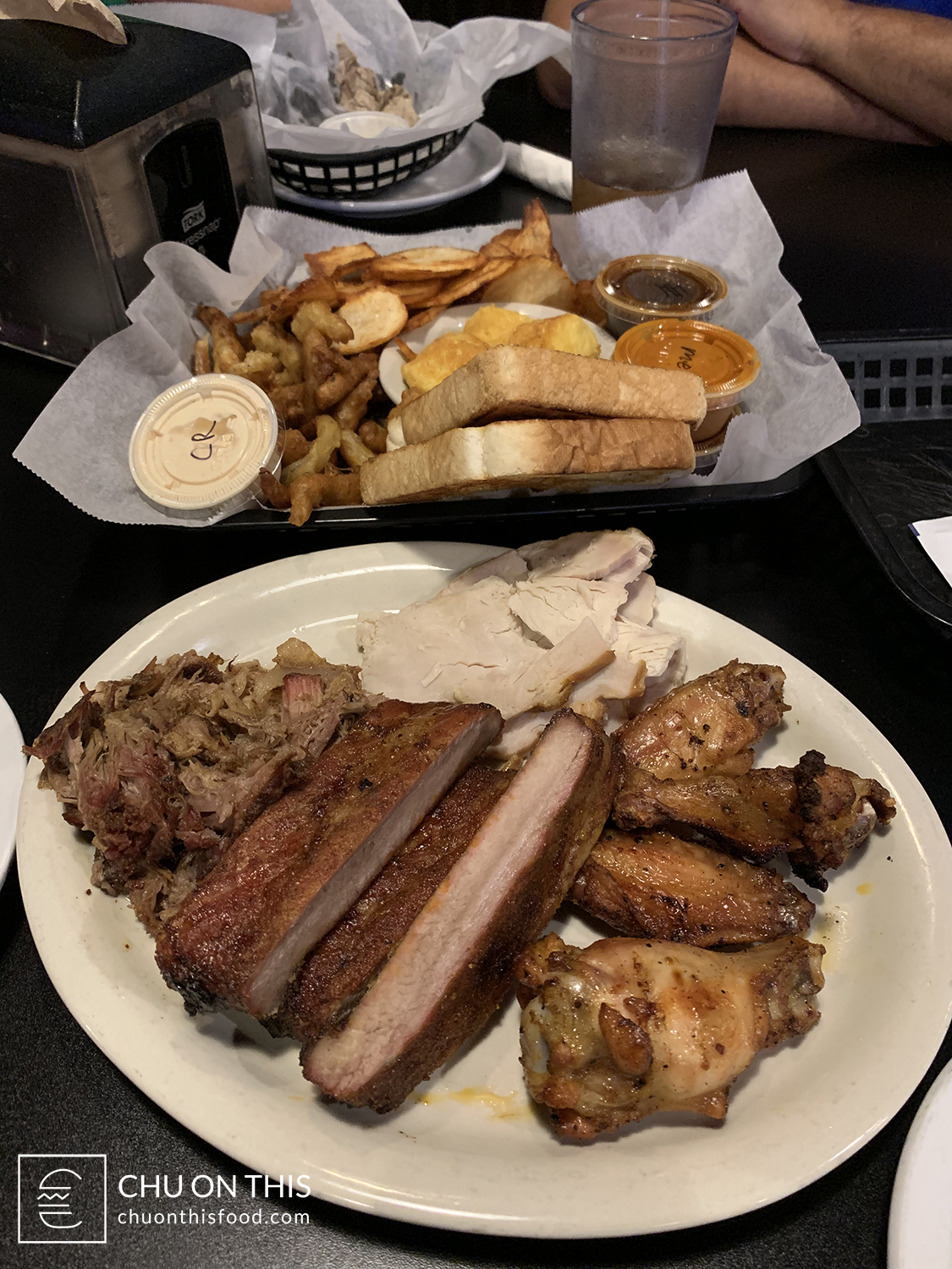 Pulled pork, smoked turkey, ribs, and smoke-fried chicken wings, accompanied by ale-battered onion petals, chip-cut fries, jalapeño cornbread, and Texas toast.