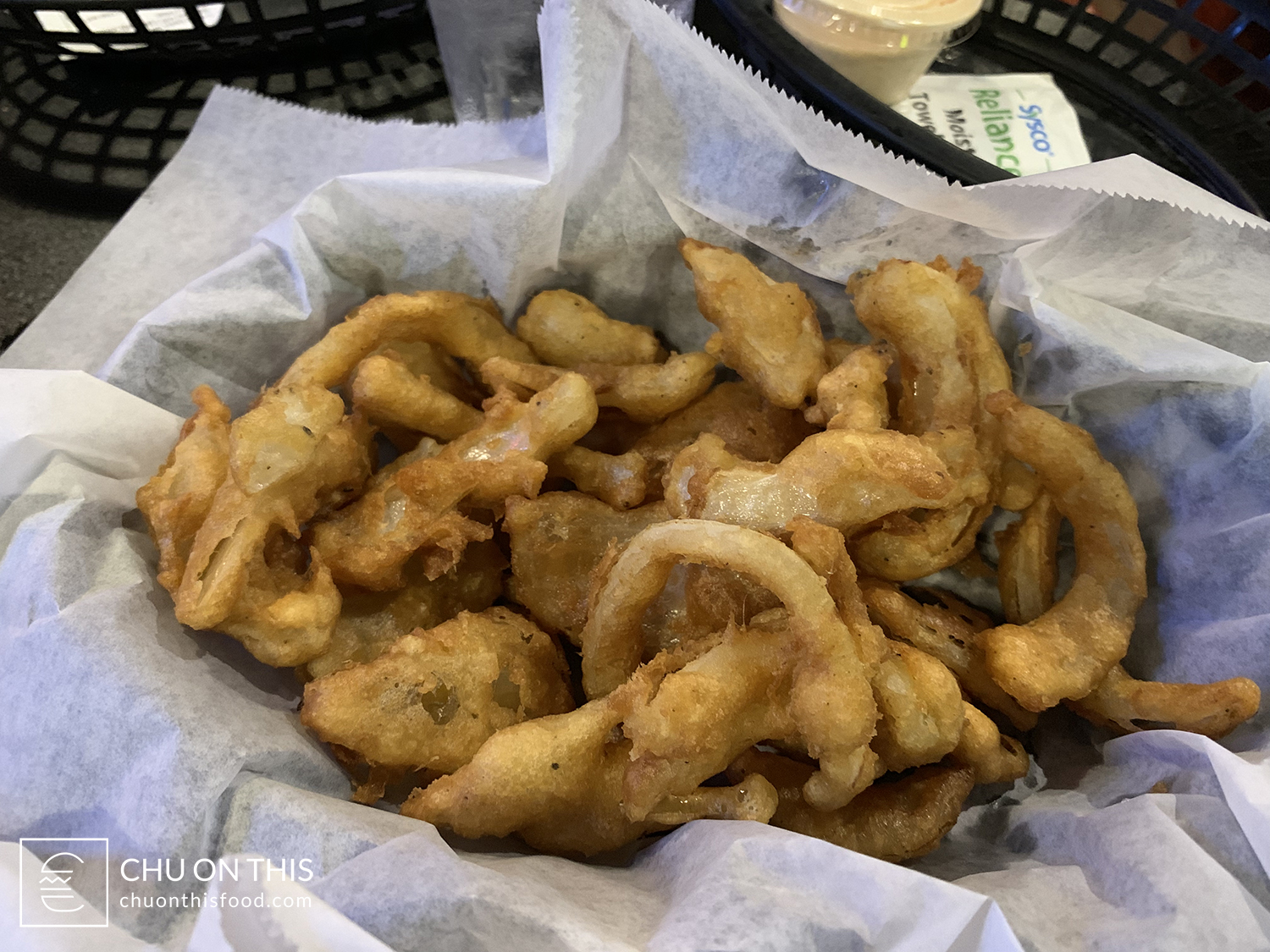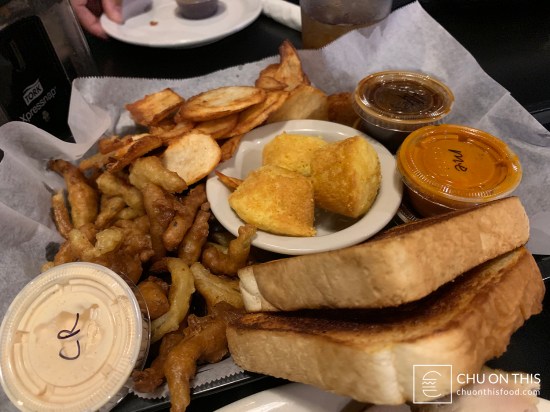 Certainly no complaints on the sides, either. Jalapeño cornbread had a savory flavor from the initial bite, but then finished off with some sweetness from a honey drizzle and that slight spicy kick from the jalapeño. Both the chip-cut fries and ale-battered onion petals were fried nice and crispy, pairing well with some of the sauces we ended up getting.