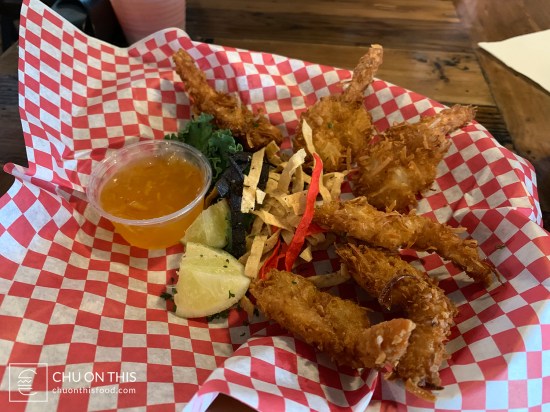 Six large shrimp, breaded with shredded coconut and deep-fried. Served with orange marmalade sauce.