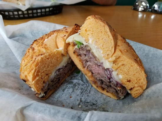Thin slices of steak with sautéed green peppers and onions, topped with melted provolone cheese, on an Asiago cheddar bagel.