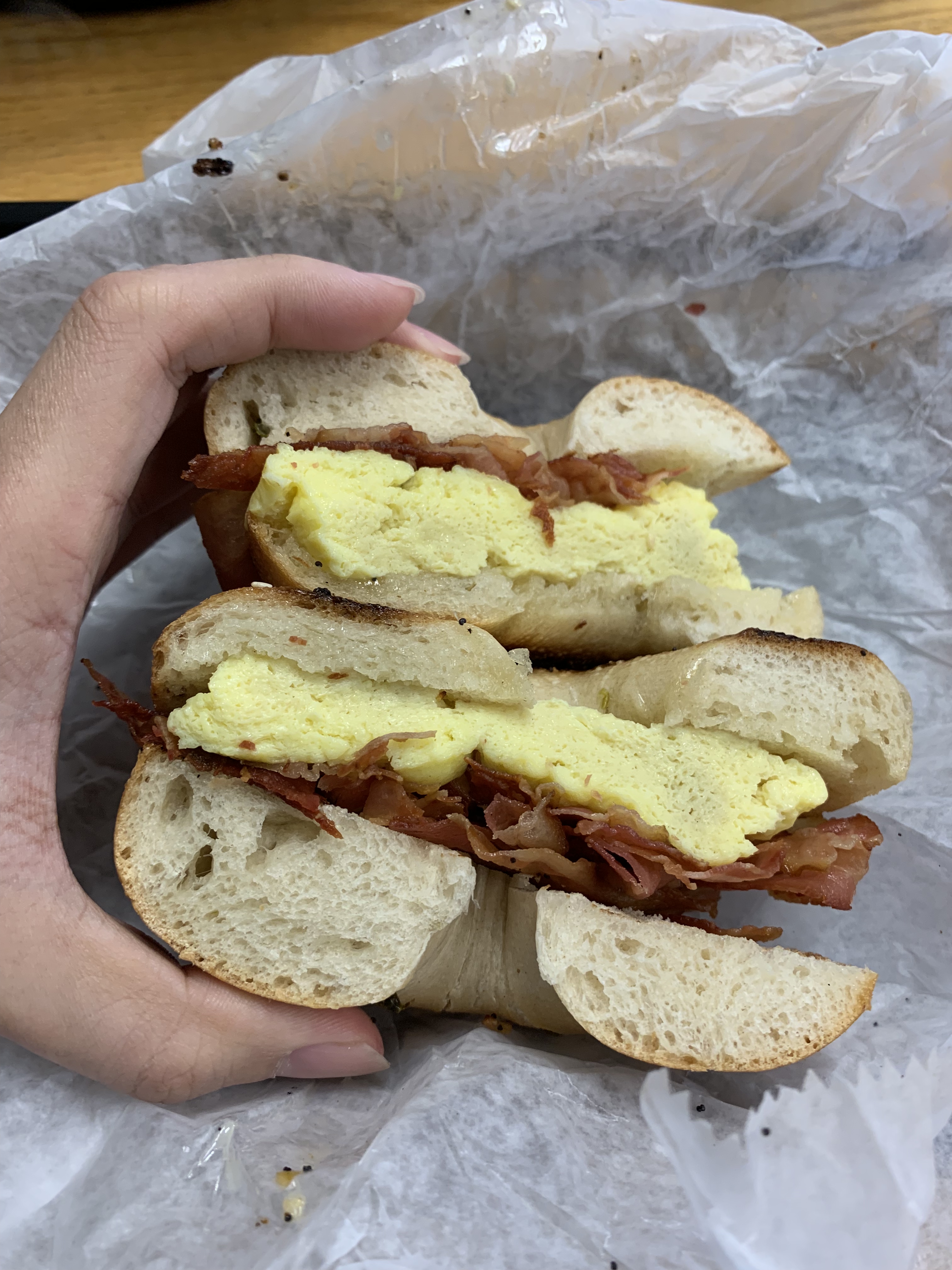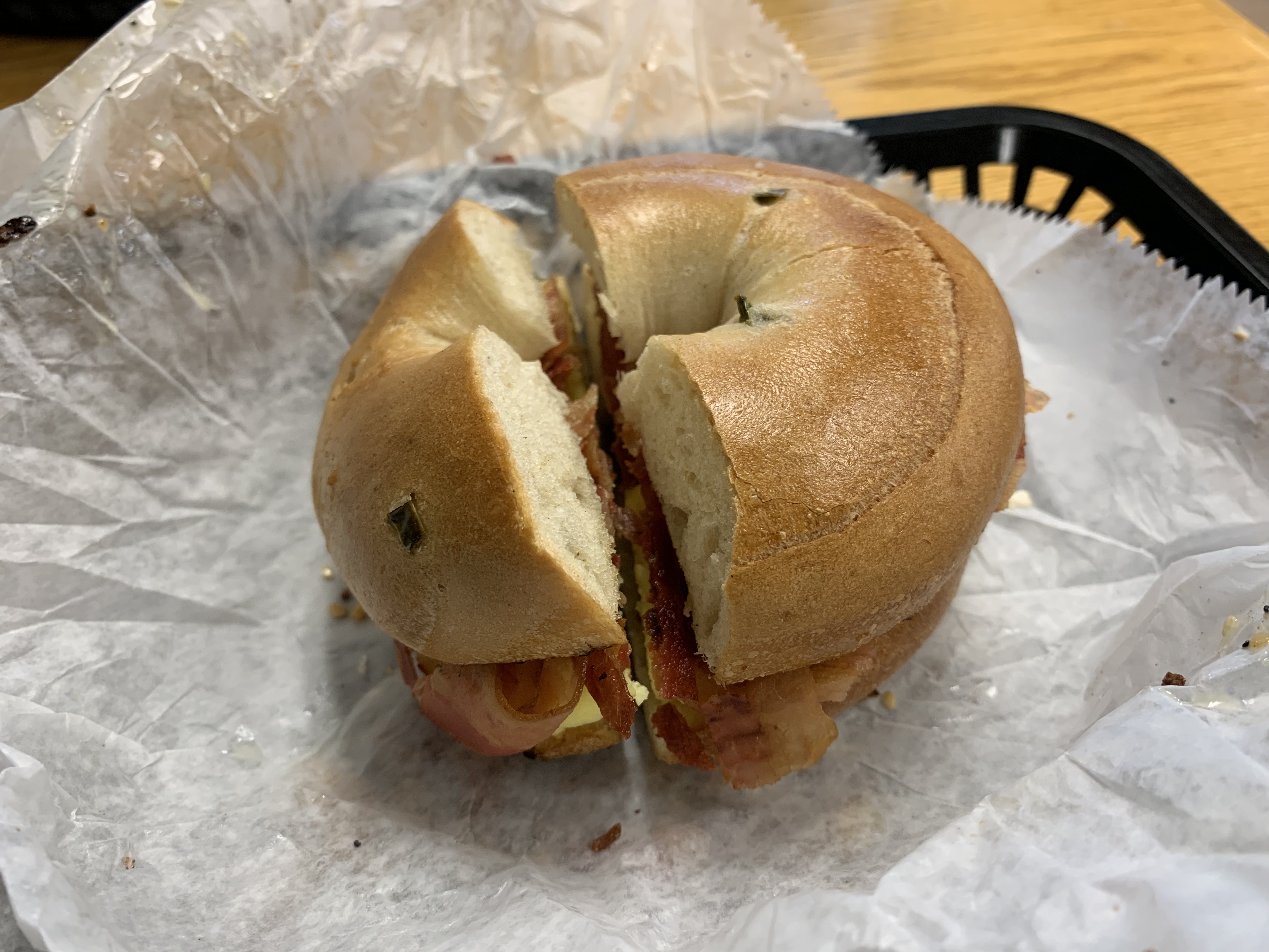 Bacon strips and egg, on a toasted jalapeño bagel.