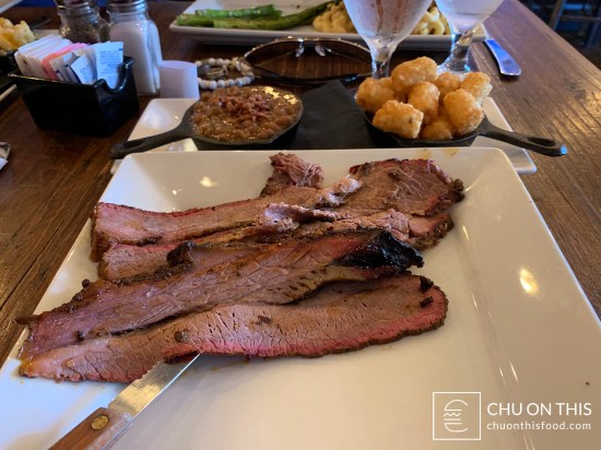 I’ll be perfectly honest, when the plate of brisket got set down in front of me, I was pretty underwhelmed. Four thin strips of brisket that only took up half of a square plate and probably weighed no more than a 1/3 of a pound. The two sides of baked beans and tots were served in these mini cast iron skillets that I thought were a nice added decorative element to the plating. But I couldn’t get past the fact that I was looking at $21 worth of food.