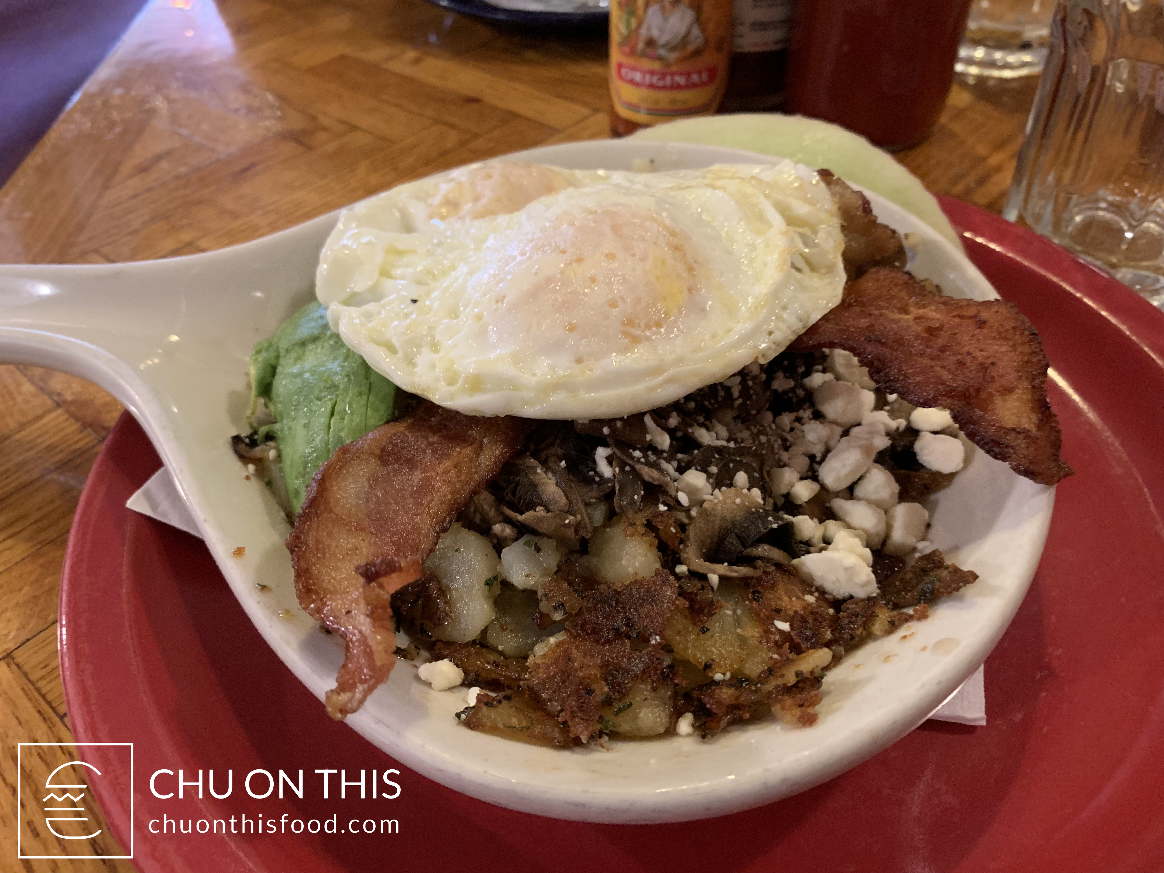 I’m not one to shy away from breakfast food, so I decided to switch it up from my normal omelette breakfast order and give one of their skillets a try. The Emerald Bay skillet came with bacon, avocado, mushrooms, feta cheese, and an over-easy egg on top of a bed of hash brown potatoes. Ingredient-wise, it definitely sounded like the most interesting option of the skillets on the menu.