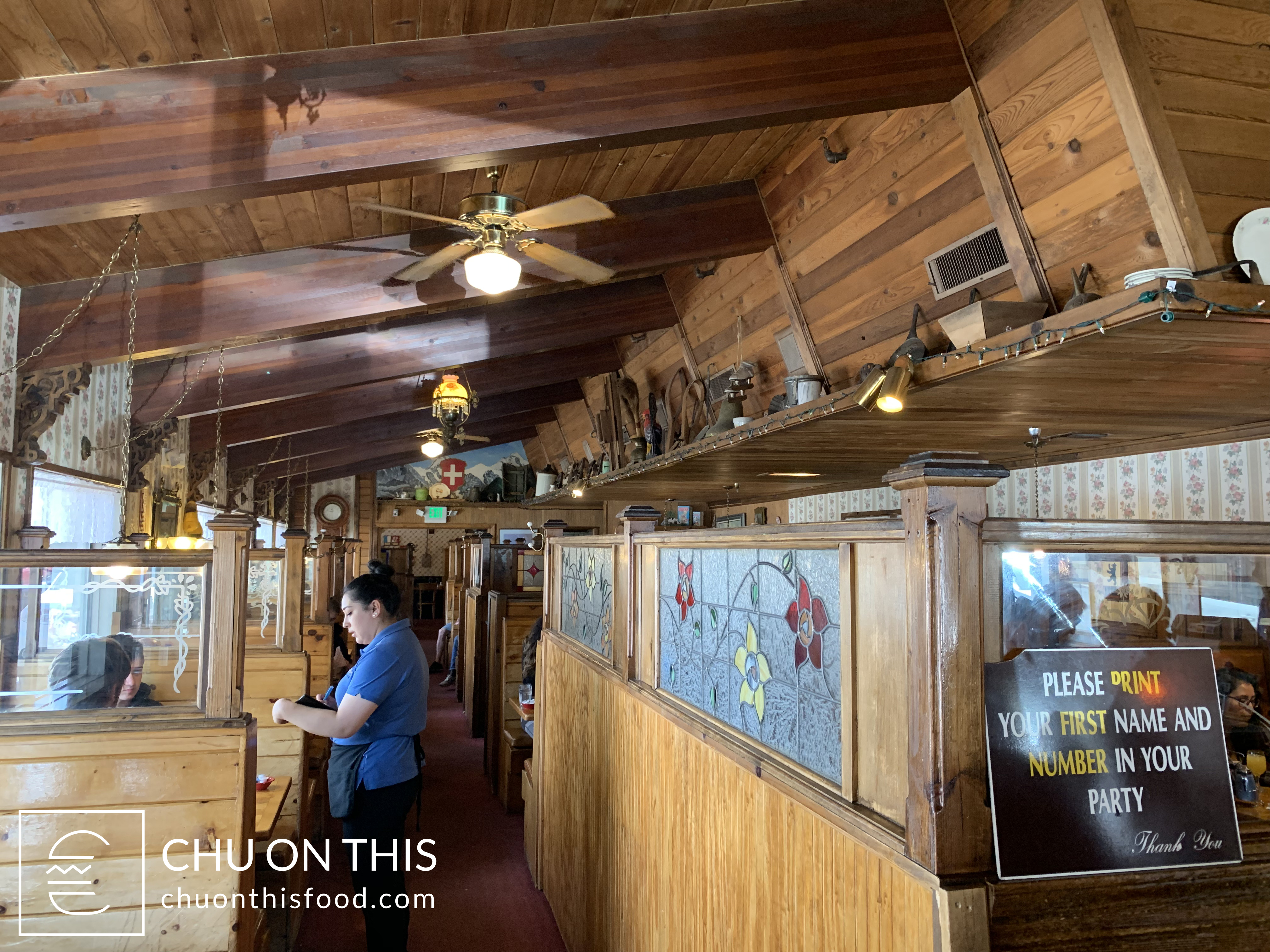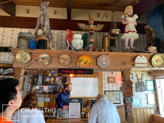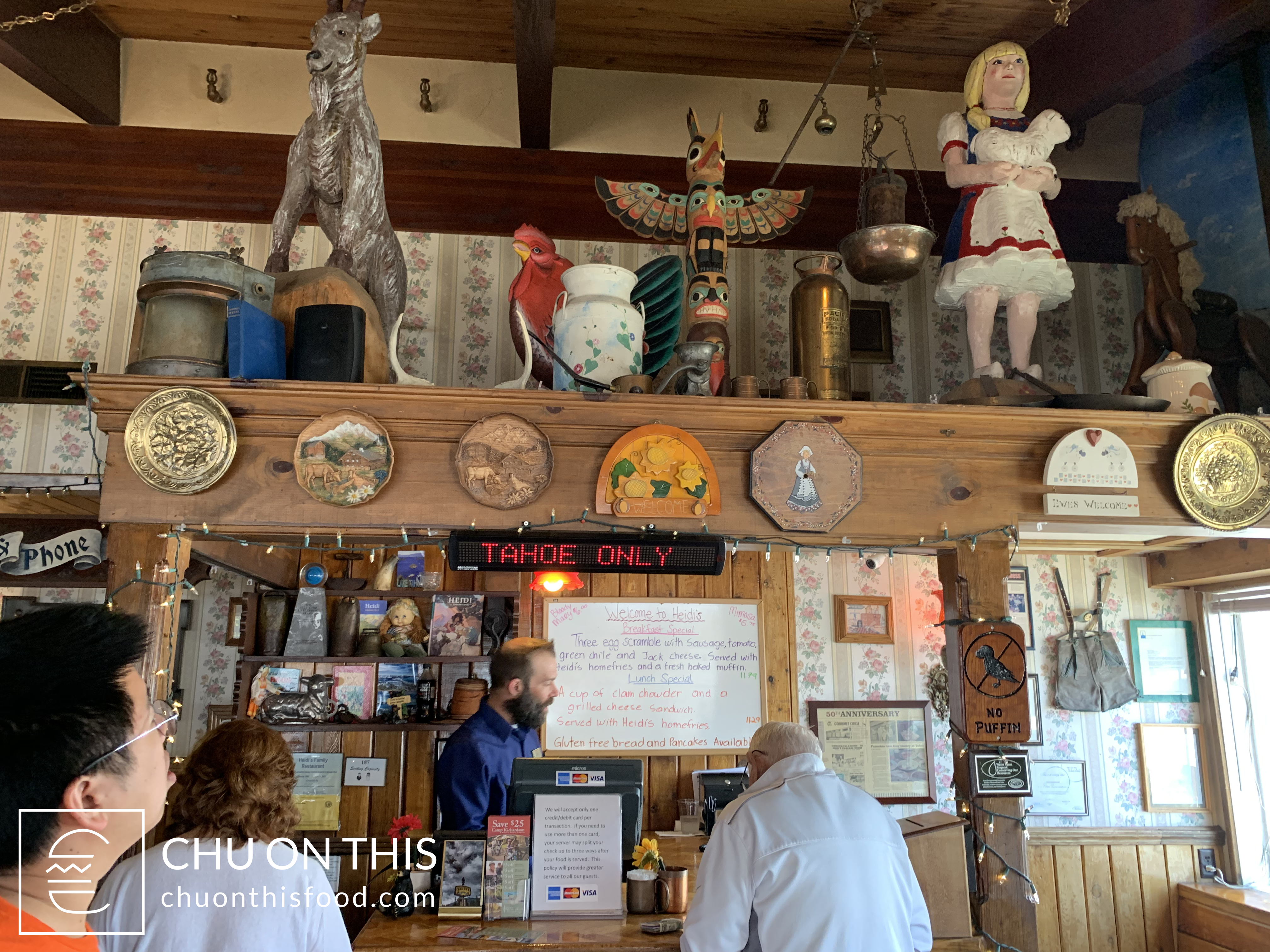 The resort we were staying at was located on the south side of Lake Tahoe, which was perfect, since Heidi’s was literally just down the street. It’s hard to miss when you’re driving by: there’s a big sign with the restaurant name and the exterior was painted yellow, which definitely helped it to stand out from the other buildings around it. Step on inside and you definitely feel like you’re at an old school ski lodge.