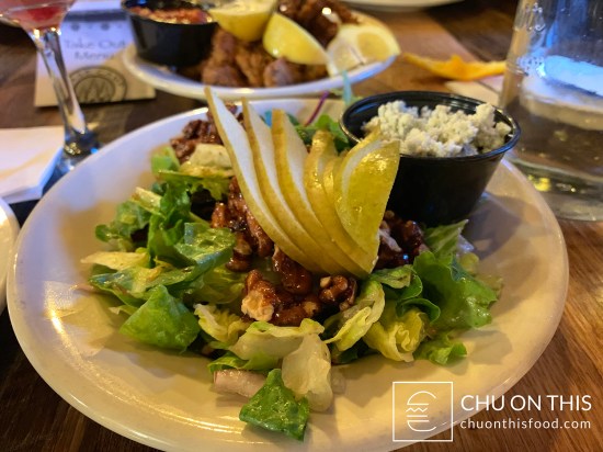 All things considered, the calamari checked all the boxes: sizable pieces, tasty batter, and not overly fried. I’d say it was average, however, compared to some others I’ve had in the past, but it certainly hit the spot. I actually enjoyed the salad a lot more than I was expecting to. The balsamic vinaigrette and the red onions definitely provided the tart flavor and some acid, while the pears and candied walnuts helped to balance out the flavors.