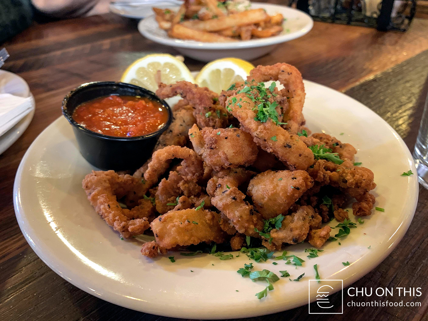 Squid lightly battered and fried to a golden brown. Served with marinara sauce.