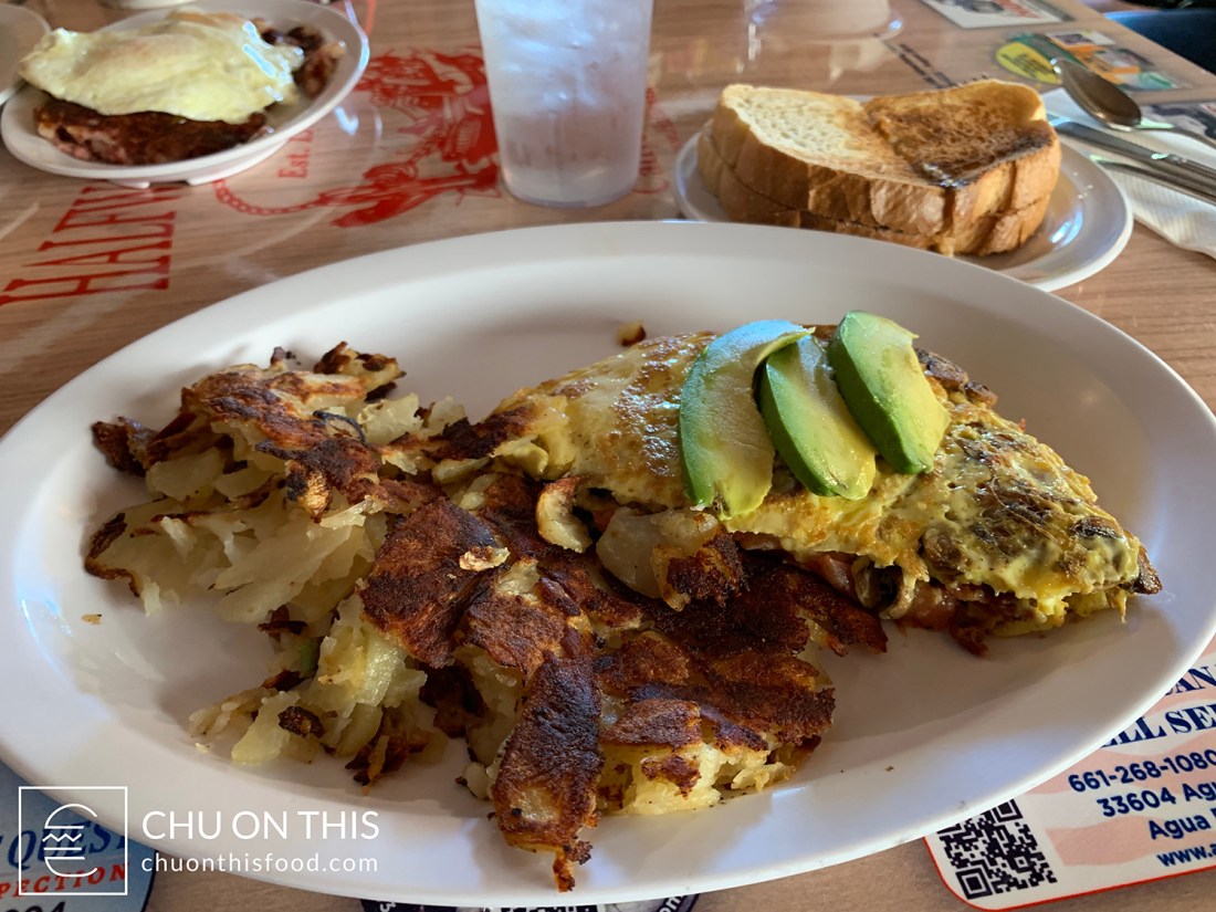 I’ve mentioned before that I’m an omelette guy when it comes to eating out for breakfast, so the Deluxe Omelette was right up my alley. Mushrooms, avocado, bacon, and tomatoes, coupled with a side of country potatoes and sourdough toast. Definitely a good-sized portion indeed.