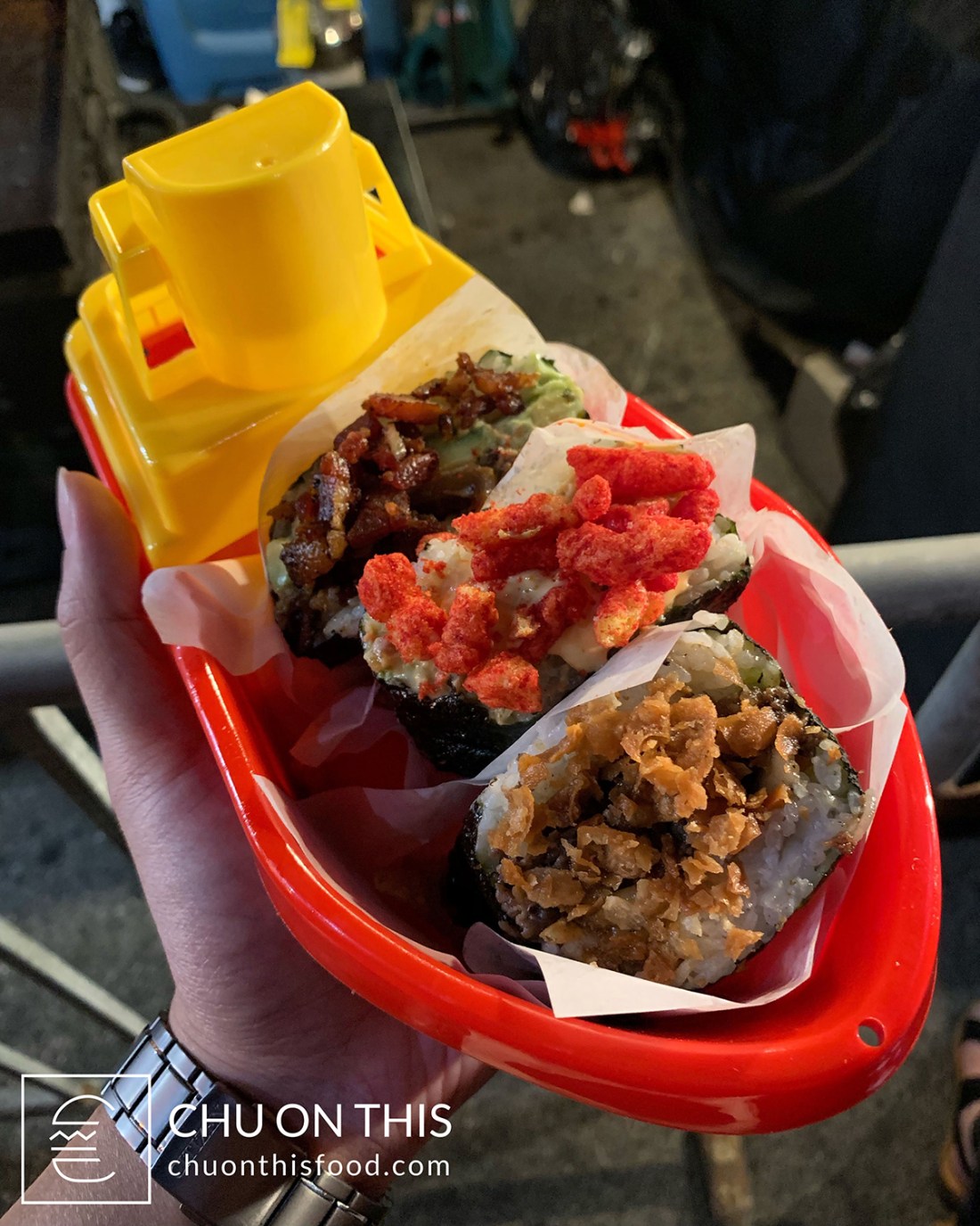 What might you consider a fusion musubi, you ask? WFUB offers up three different types: bulgogi with crispy wonton chips, spicy salmon poké with Flamin’ Hot Cheetos, and bacon & avocado. The fillings are essentially put between two layers of rice and wrapped in seaweed, which I call a “sandwich-style” musubi. You can order them individually, or go for The Boat, which is three musubis of your choice, along with a souvenir toy boat that the musubis are served in.