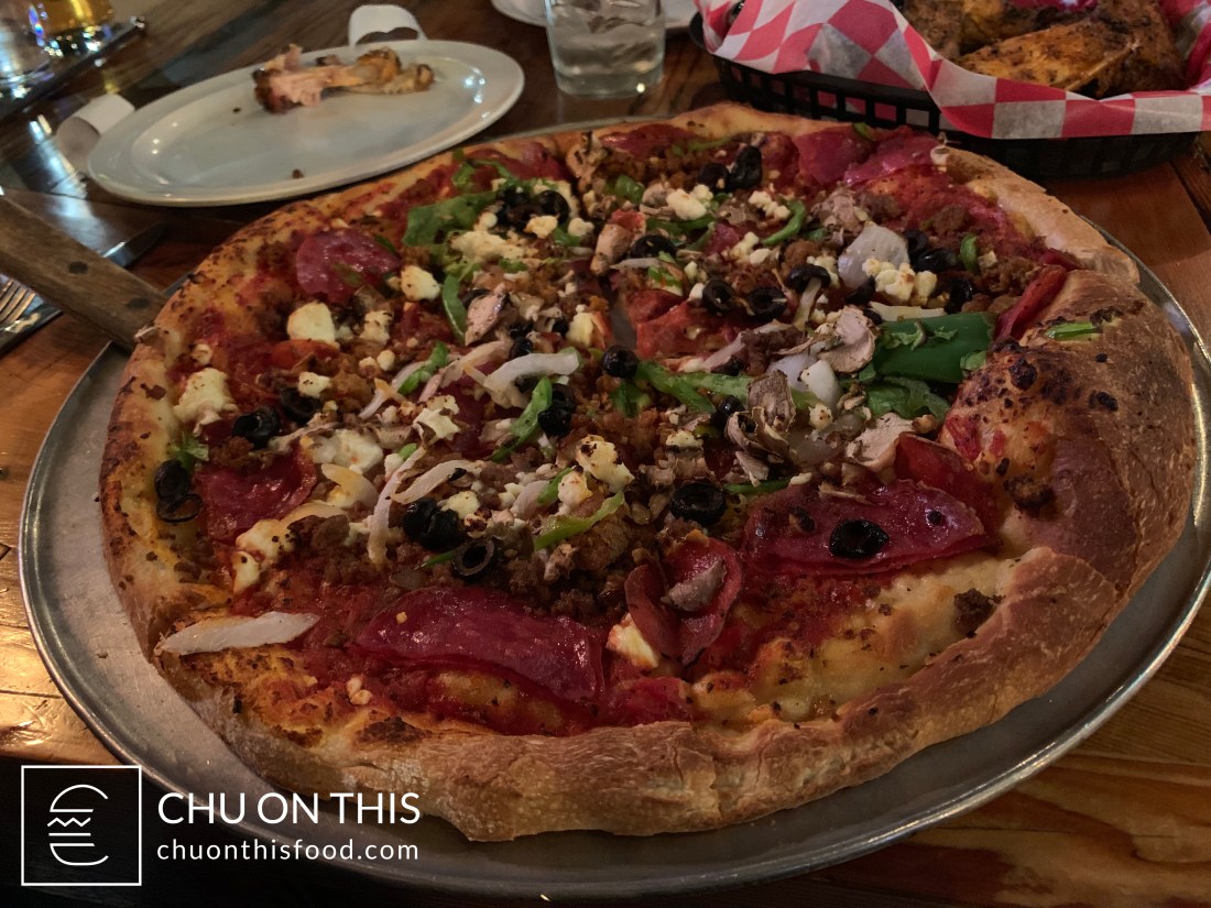 First things first, we needed to settle on an appetizer to at least keep our mounting hunger at bay. The oven baked wings sounded pretty appealing, so we decided to put in an order, tossed with their signature dry rub. While one of the staff helped run our wing order over into the kitchen, that gave me enough time to finish deciding on a pizza. The Big Fizz ended up coming out on top: pepperoni, salami, white onions, green peppers, mushrooms, ground beef, black olives, and Polidori Italian sausage. Normally, it comes with mozzarella, but I asked for a substitute of feta instead.