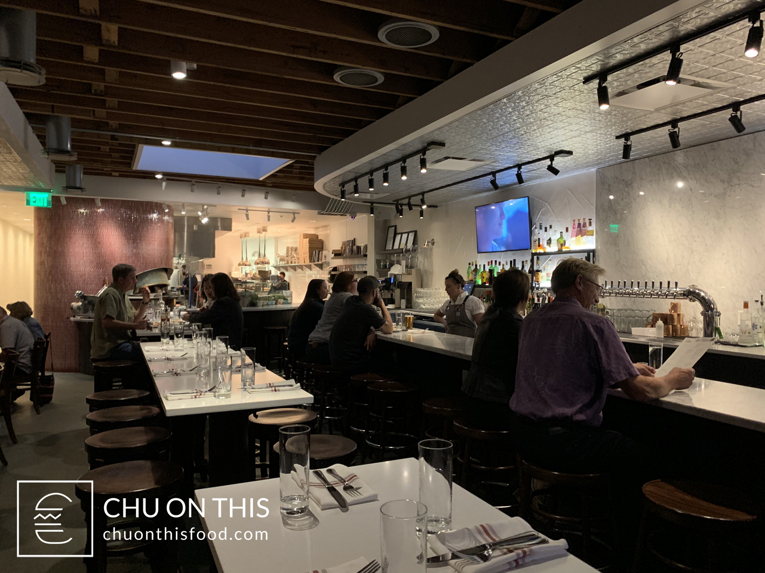It seemed like a relatively casual atmosphere in the outdoor dining patio in the front of the restaurant, where there were a good number of people seated. But the moment you step inside, you immediately get a chic vibe from the place. The bar top was made from smoke gray granite that blended in really nicely with the rest of the restaurant’s décor. The high tops that we got seated at were made from either quartz or some other type of polished stone. But even though the atmosphere inside might have felt a bit refined, I didn’t feel out of place at all dressed in a polo and jeans.