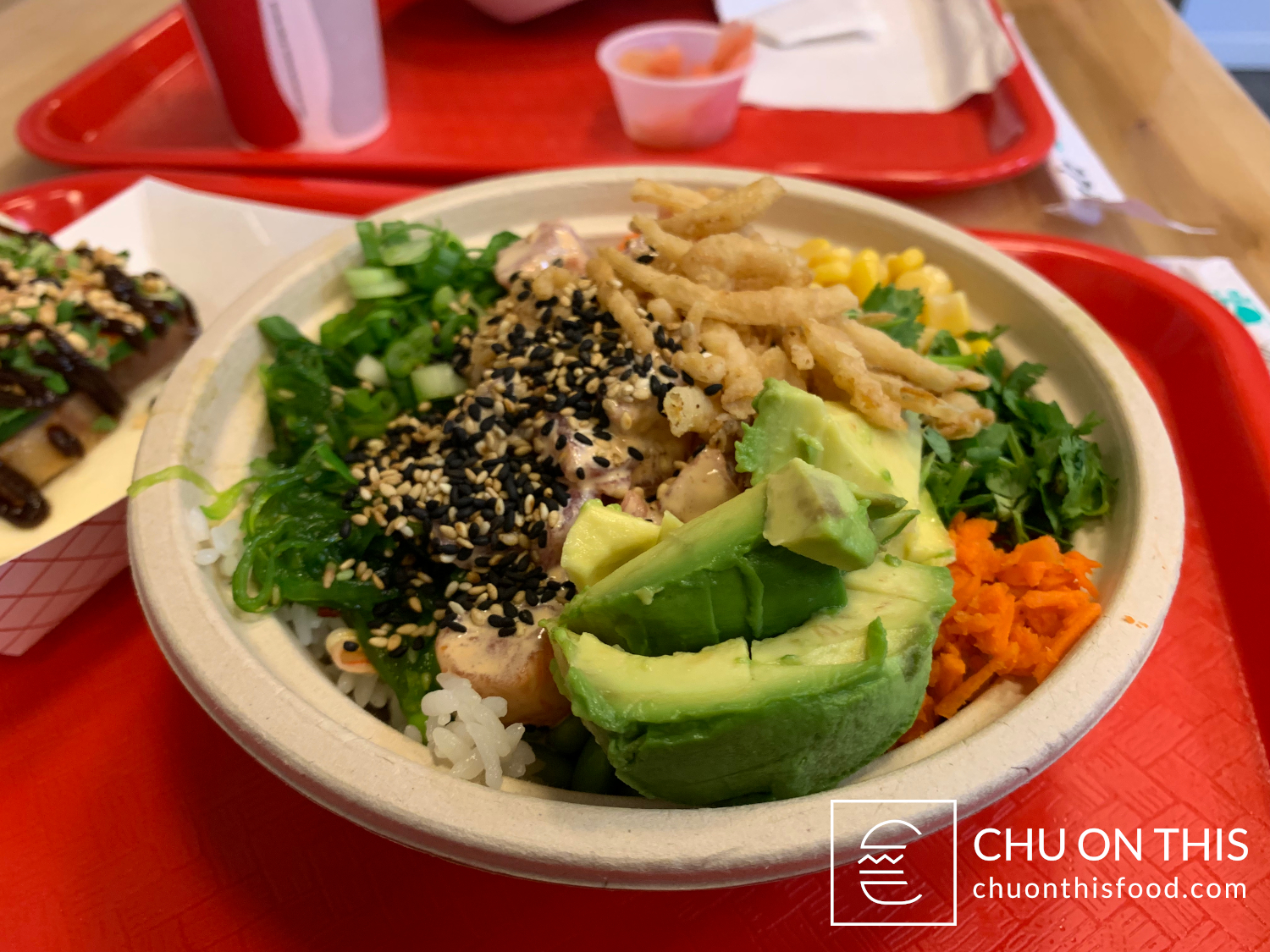 For my bowl, I went with a white rice base, with salmon and tuna being my main proteins. Toppings-wise, I got masago, corn, cilantro, shredded carrots, avocados, seaweed salad, krab salad, scallions, edamame, fried onions, and sesame seeds. I also asked for the fish to get tossed in some spicy mayo and citrus ponzu before they dropped them into the bowl. All things considered, it ended up being a pretty sizeable mound of food when everything got put together.