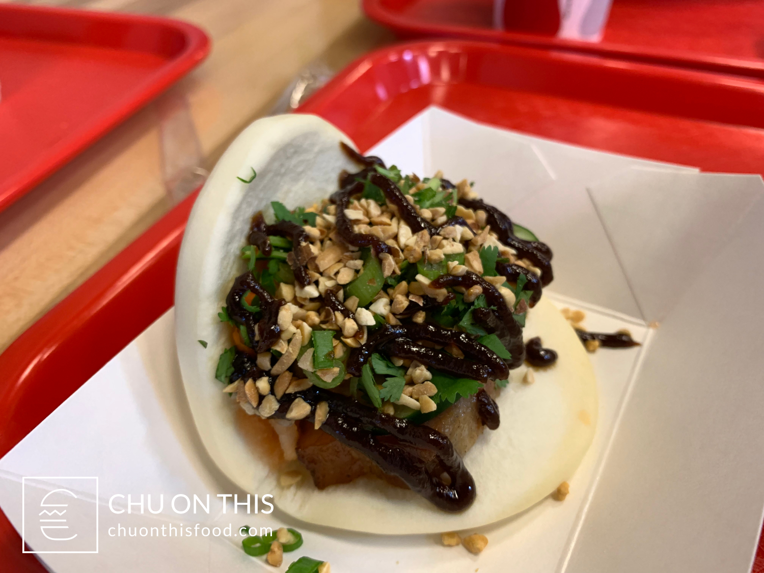 Roasted crispy pork belly with cilantro, cucumbers, Asian slaw, scallions, crushed peanuts, and Hoisin sauce.