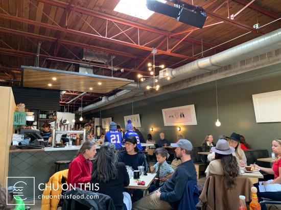 We rolled up to the place a little before 10:30 a.m., where there was already a small group of people outside waiting for a table. It was clearly a pretty busy morning, but we luckily managed to get seated right away at one of the two-person tables. Our waitress, Erika, stopped over at the table almost immediately to greet us and to bring some waters before talking to us about the brunch menu.
