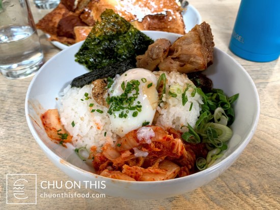 Tooele Farms pork belly, house kimchi, scallions, bonito flakes, nori, and a sous vide egg, served over white rice.