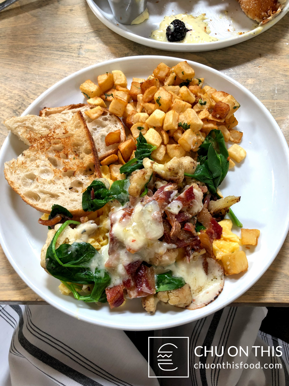 Bacon, roasted cauliflower, spinach, and melted Gruyere cheese, with house potatoes and toast.