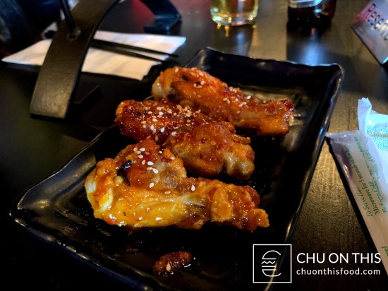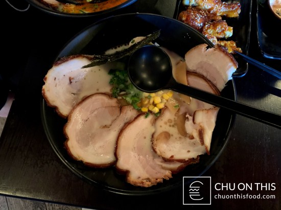 Ramen-wise, you had seven different options to choose from, stemming mostly from either a pork bone broth or chicken broth base. I decided to stick with my usual choice of the tonkotsu ramen, which had the rich pork bone broth, pork belly, soft-boiled egg, corn, scallions, menma, and nori. I also opted for my usual move of getting some extra pork belly added on as well. Tina went with the tantan tonkotsu (same ingredients as mine, with the addition of some spicy ground pork), and we also decided to get two of their snack plates as well for appetizers: spicy wings and gyoza.