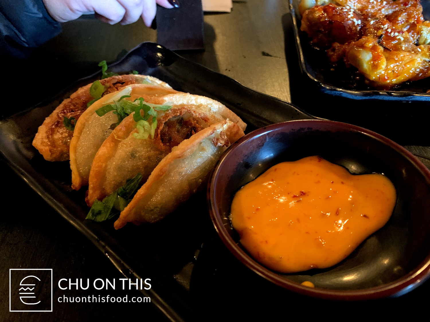 Fried pork gyoza, served with a spicy mayo sauce.