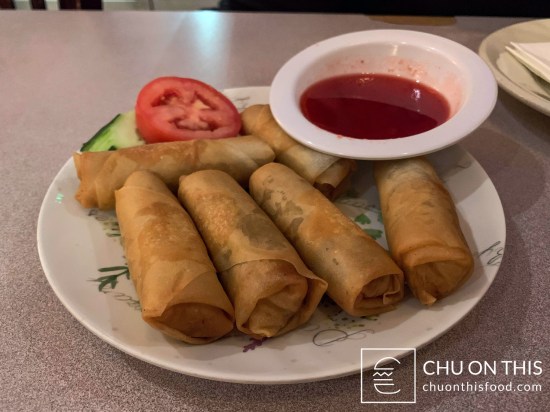 Both the egg rolls and the chicken satay arrived out to the table, and one dish definitely looked a bit better than the other. The egg rolls were crispy and loaded with shredded vegetables and glass noodles. I found them flavorful enough on their own that I didn’t need to dip it into the sweet & sour sauce that was served on the side. The chicken satay, on the other hand, didn’t have that characteristic yellow curry color that I’m normally accustomed to seeing, and didn’t have any grill marks on the outside for being charcoal grilled. In place of being served with peanut sauce, the chicken had one slice of white bread, cut in half, off to the side. I thought it was a slightly strange side item, and I’m honestly not sure if I’d order the satay again.