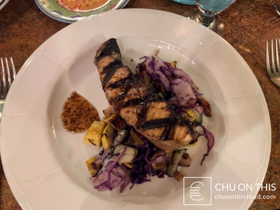 We were on the tail end of wrapping up the salad when our entrées arrived. My salmon steak definitely had the look to it, with the cross-hatch char marks from the grill right on top. It was served on a bed of sautéed vegetable medley, which included red cabbage, onions, zucchini, and squash. You could definitely get that grilled flavor from the bites of the salmon, which was still pretty moist throughout the entire steak. I might have gotten one small bone in one of my bites, but my mom unfortunately got a branzino fillet that seemed to be riddled with bones. Flavor-wise though, it seemed like both fish hit the mark.