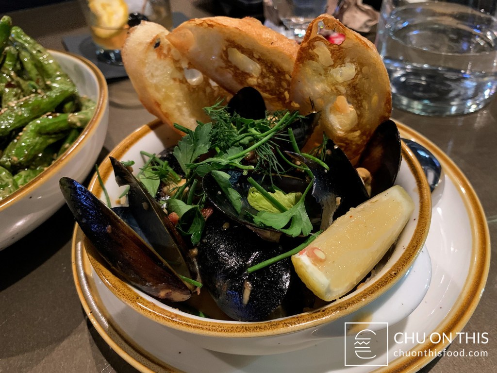 Whenever Hoang and I visit a new place, we definitely like to try and get a good variety of dishes to sample from the menu. In our case, we ended up going with two appetizers and two entrées: the Bowl of Mussels, Blistered Shishito Peppers, Swedish Meatballs, and Honey Herb Fried Chicken Sandwich.