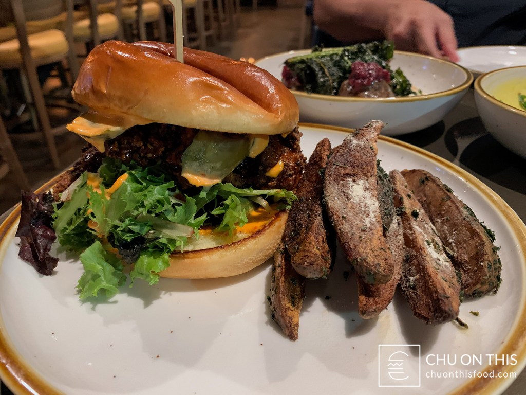 I did need to stretch out my mouth to fit a full bite of the sandwich, since it was stacked so high, but I did get a nice blend of sweet and tangy flavors. The mild aromatics that came from the honey herb glaze were in the aftertaste, but it was the harissa aioli, pickled red onions, and pickles that really provided the tanginess. I initially didn’t know that the dusting on the potato wedges was the malt vinegar powder, but I think it really helped to give them a different depth of flavor that I hadn’t experienced before.