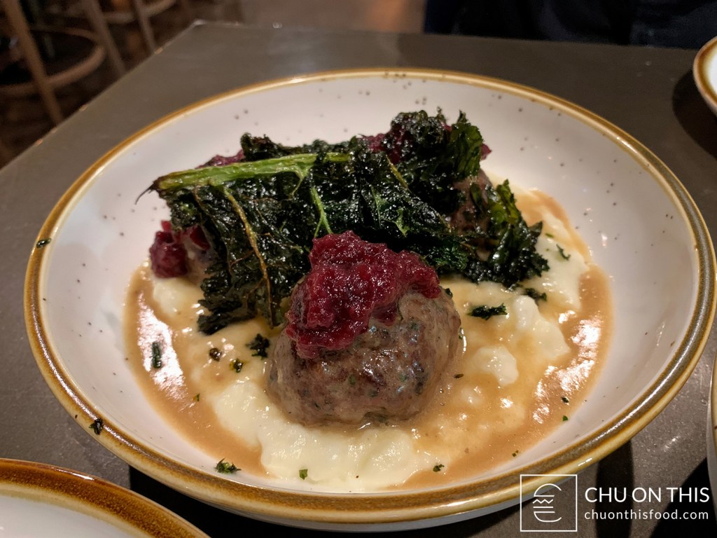 Pork meatballs served with a berry compote, fried kale, gravy, and Parmesan grits.