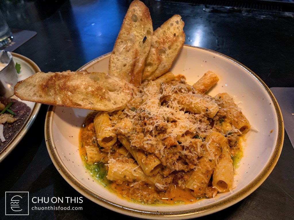 Rigatoni, beef and pork Bolognese, basil, crème fraiche, and breadcrumbs. Served with garlic toast.