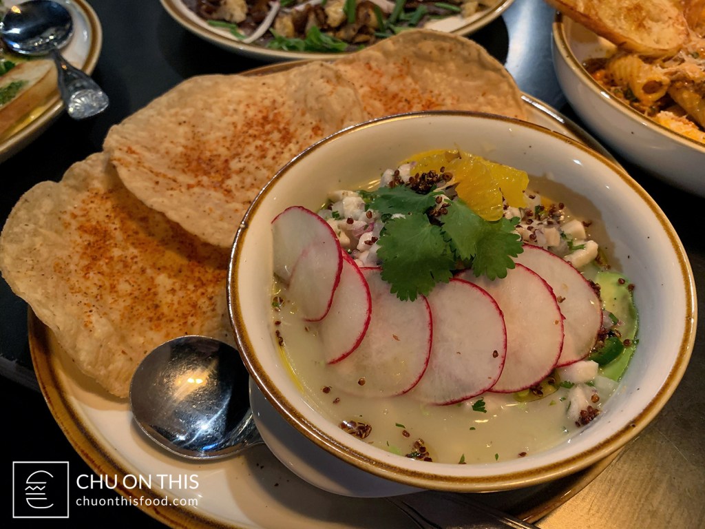 White fish, jalapeño, cilantro, oranges, radishes, avocado, and fried quinoa. Served with fried taco tortillas.
