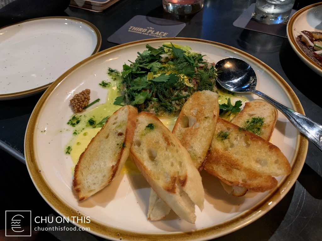 Steak tartare with dill and parsley on top. Served with rubbed garlic toast.