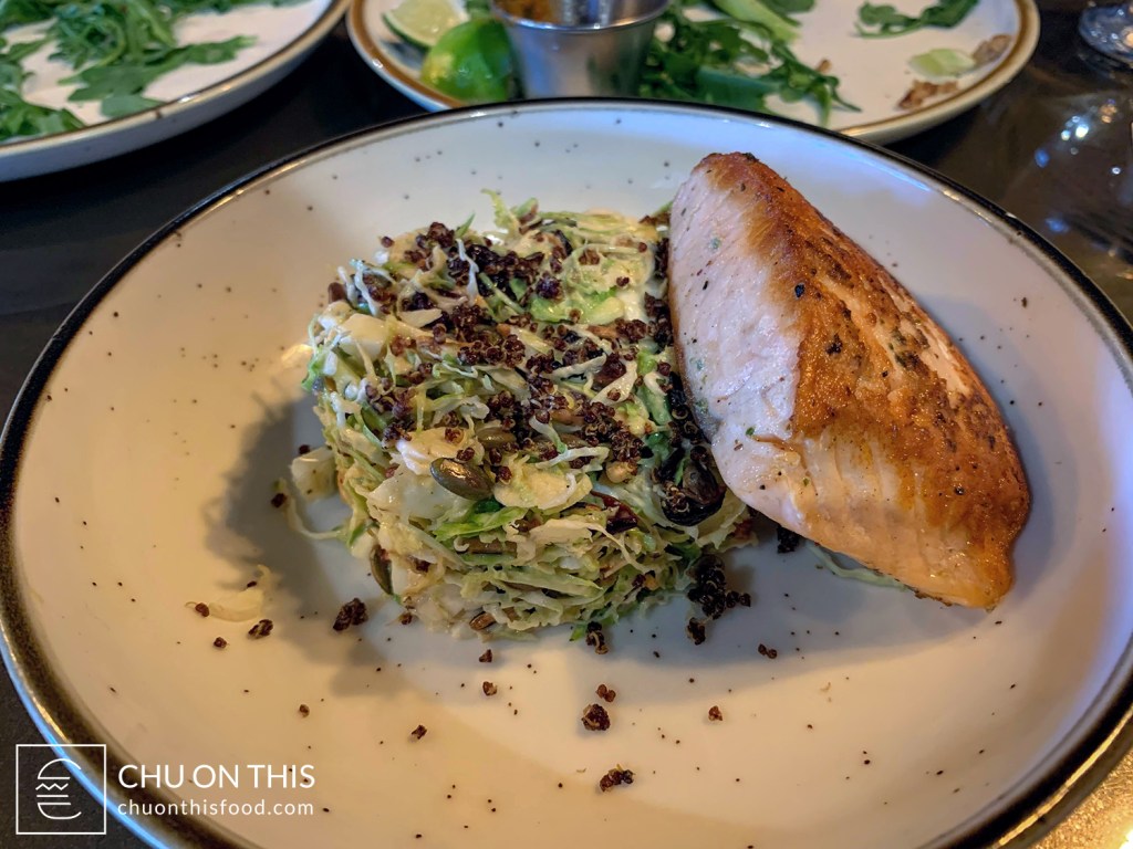 Shaved brussel sprouts with dried cranberries, almonds, pepitas, bacon, egg, fried quinoa, Parmesan cheese, and champagne vinaigrette. (Pictured with added grilled salmon.)