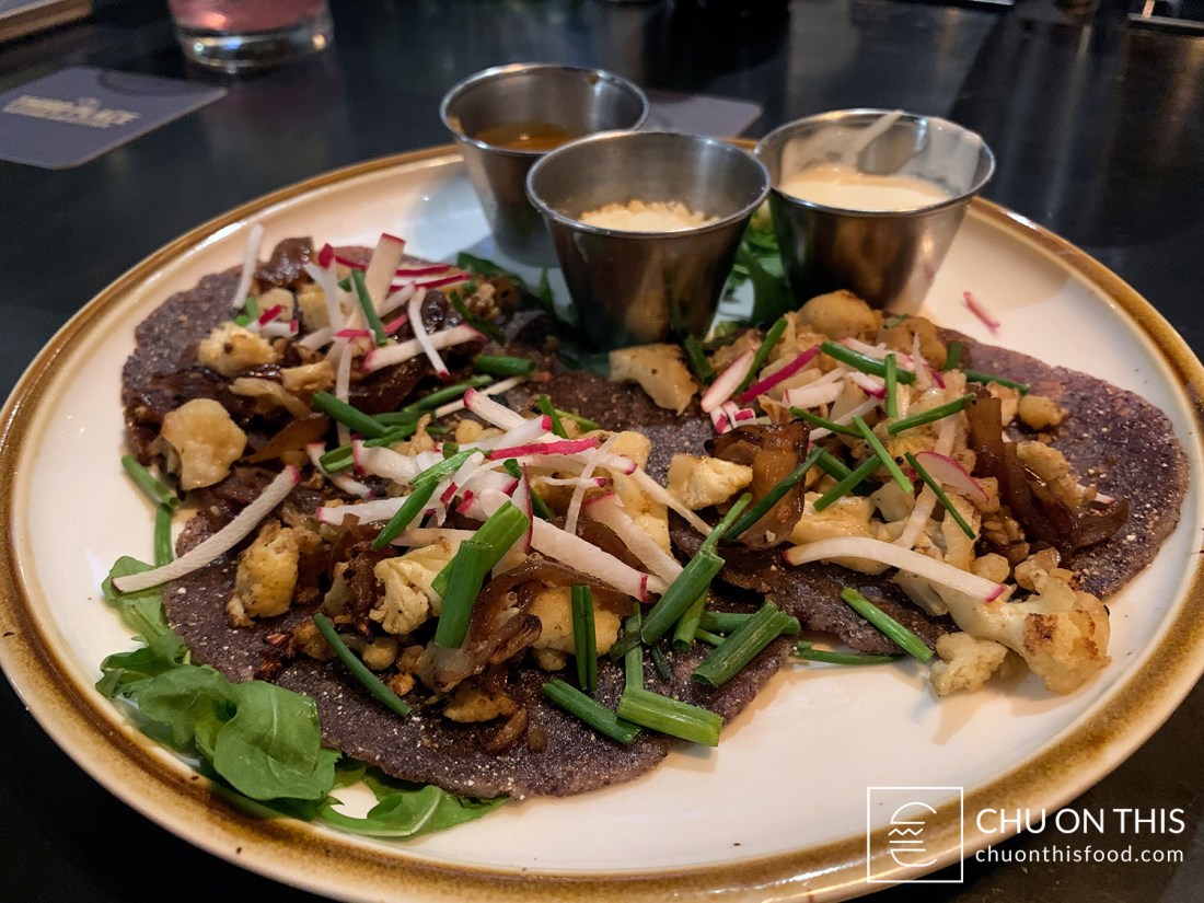 Roasted cauliflower with caramelized onions, cotija cheese, scallions, and radishes, served on blue corn tortillas. Side of crema fresca and salsa.