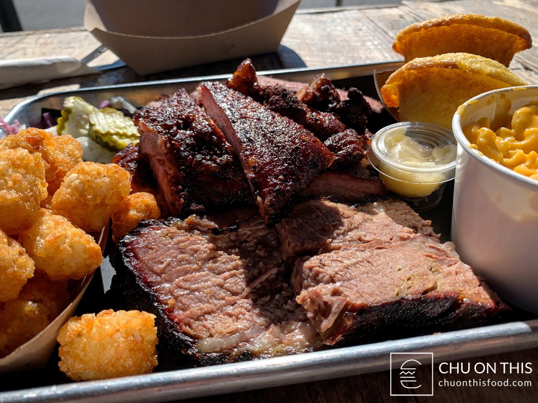 After talking it over, we settled on going for the three-meat combo plate, which also included three side dishes. The brisket, spare ribs, and tri-tip roast were our meat options, rounded out by sides of tater tots, mac & cheese, and cornbread with honey butter. We were able to grab a table outside pretty easily, since we had mostly seen people ordering take-out up to that point. Later on, however, it definitely started to get a little busier and more people started to hover and wait for the table seating.