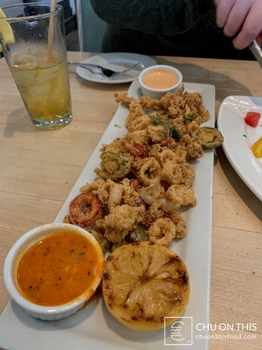 The menu offers a variety of different fish fillets and shellfish, which could also even come in the form of tacos, sandwiches, pastas, or salads. There were plenty of appetizers that sounded pretty good, but we decided to go with a trio selection of the Crab Cakes (Alina’s favorite), Crispy Calamari, and Miso Glazed Black Cod. For my entrée order, I went with the Sesame Seared Ahi Tuna.