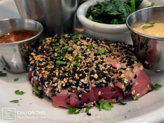 Pan-seared ahi tuna steak with a sesame seed crust, served with sesame ginger sauce and Sriracha aioli. Pictured with French fries and sautéed spinach as sides.