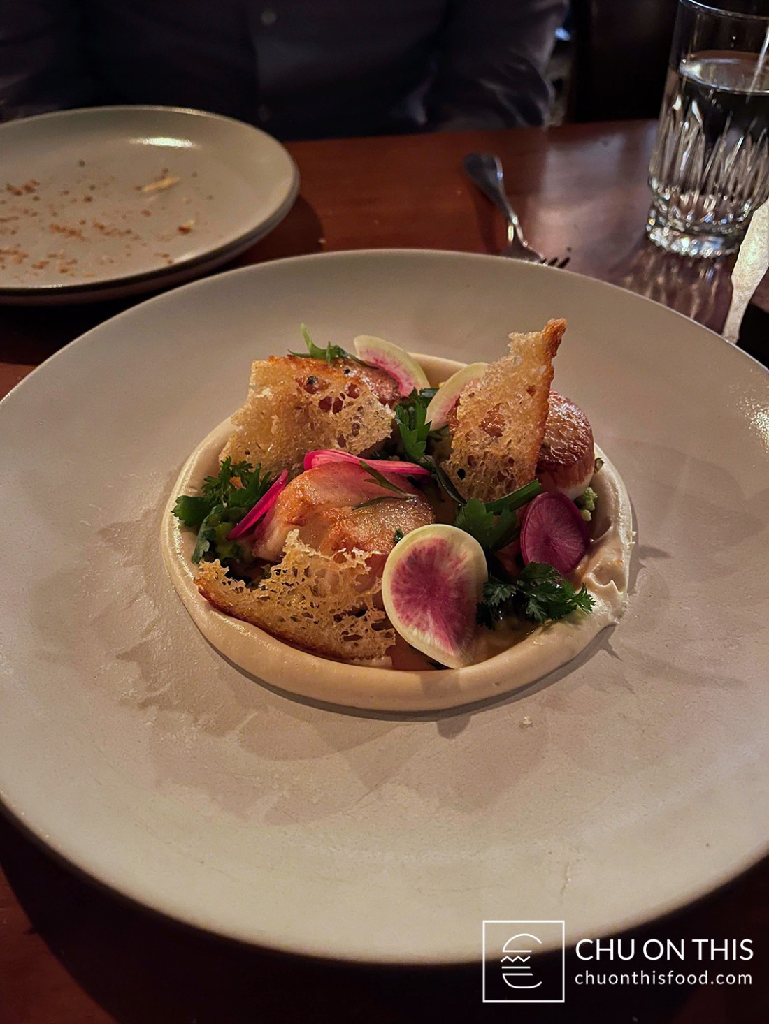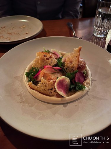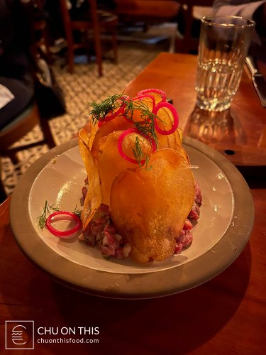 The steak tartare came to the table about halfway into us digging into the bread. I thought it was an interesting and creative presentation, with large potato chips wedged vertically into the tartare mound. The steak tartare was diced up well, with the texture leaning towards the softer side and not being too chewy. But that’s where the potato chip came in: if you scooped some tartare up onto it, you could get a nice crunch to contrast with the soft texture of the steak. That hit of salt from the potato chip also complemented the other savory, umami, and slightly tangy notes from the tartare, too.