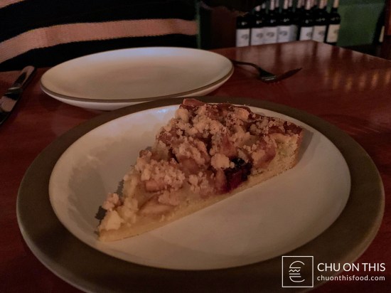 We decided to end the meal with a slice of the seasonal apple almond tart. It had a nice buttery shell, with good apple flavor throughout the tart itself. There was also raspberry in the filling to help provide, for lack of a better term, a tart contrast to the tart itself. It was a nice light and sweet ending to the meal after going through quite a few savory dishes.
