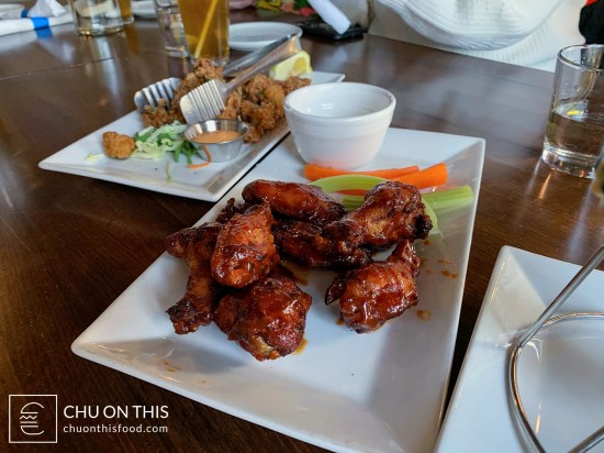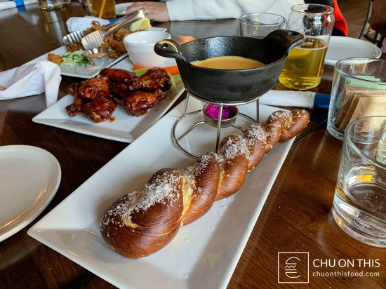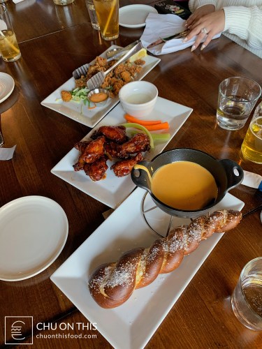 It didn’t seem like it was very long before there was a procession of plates coming out from the kitchen, comprising of all five appetizers that we ordered. They ended up taking most of the free space in the middle of the table, where we arranged them side-by-side. I first sampled the calamari, which I thought had a nice amount of seasoning on them. The chunks of squid, however, did resemble more like the size of Chick-Fil-A nuggets. The soft pretzel was pretty straightforward in terms of what to expect, and the same thing with the wings. They were supposed to be smoked, but I’m not sure if that flavor might have gotten overwhelmed by the barbecue sauce it was tossed in.